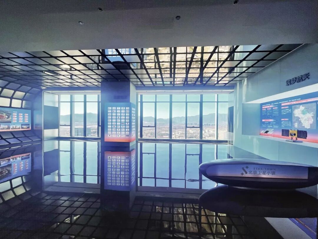 展厅位于北区最高楼、中关村壹号A1座26层。筑梦航天板块主要展示航天事业的发展历程、商业航天发展简史以及海淀建设卫星小镇的缘起。星启未来板块系统展示卫星小镇的规划与发展定位、规划布局、建设思路、空间布局与发展目标。星聚海淀板块主要展示了海淀区商业航天产业链布局以及重点企业。明日之城板块则以更直观的形式展示了卫星小镇核心区的规划和参数。同时,展厅集中陈列了我国第一颗人造地球卫星“东方红一号”、我国自行研制的全球卫星导航系统北斗三号、我国首颗平板式卫星构型的高分辨率SAR成像卫星泰景四号03星、我国首颗算力试验卫星辰光一号等卫星模型,覆盖通信、导航、遥感、算力等多种类型,生动展现我国航空航天事业发展成就与商业航天创新成果。