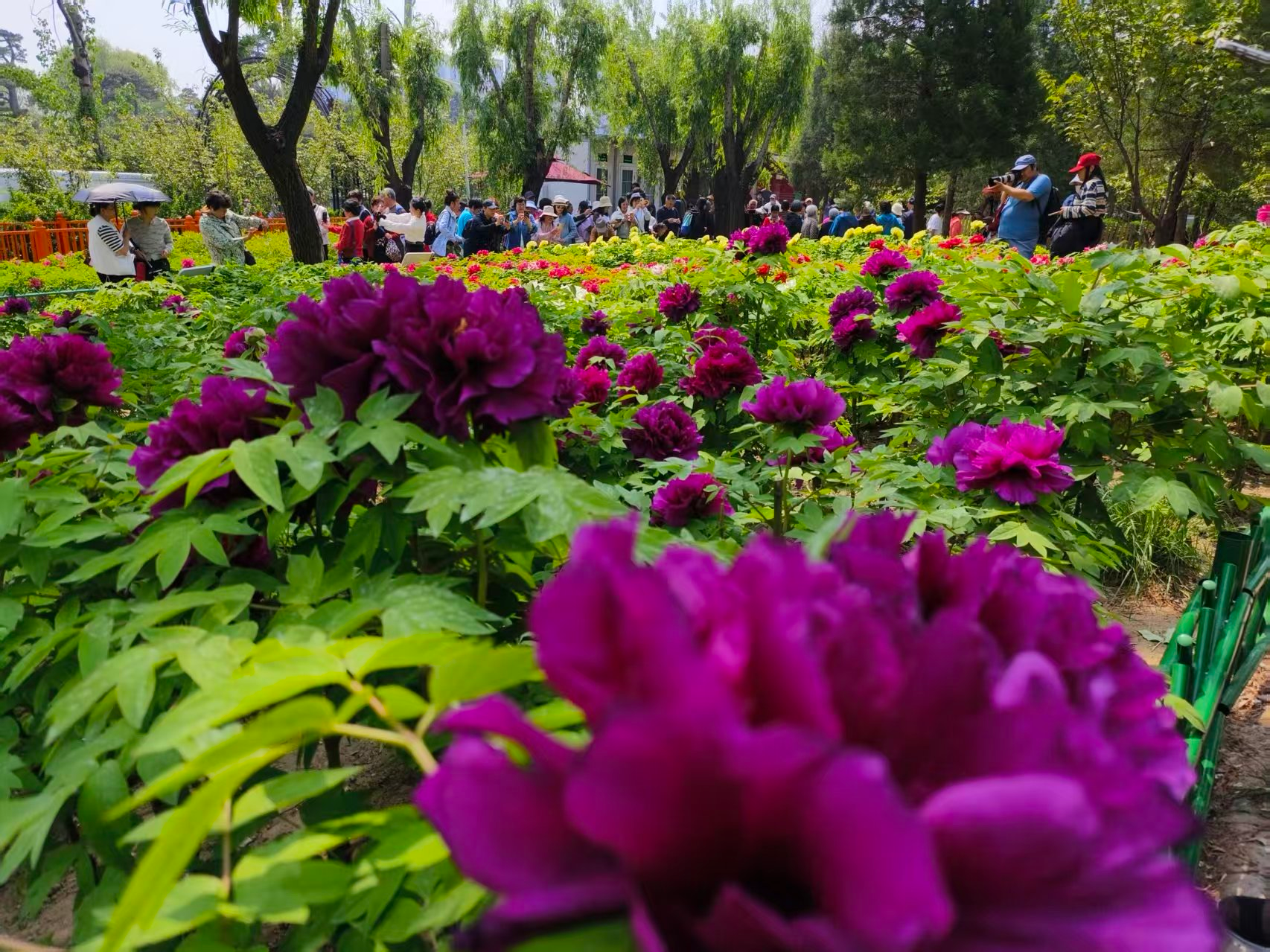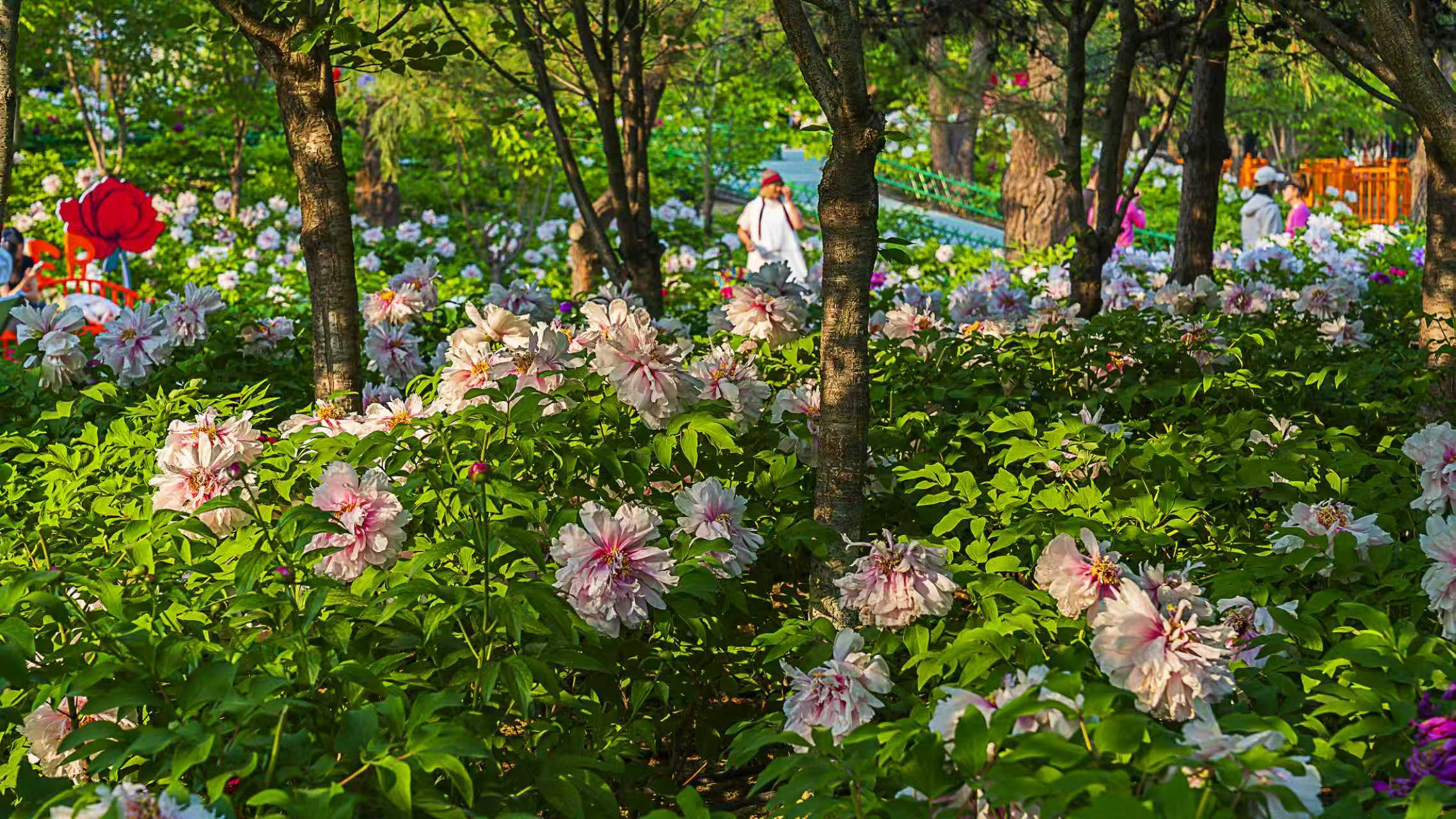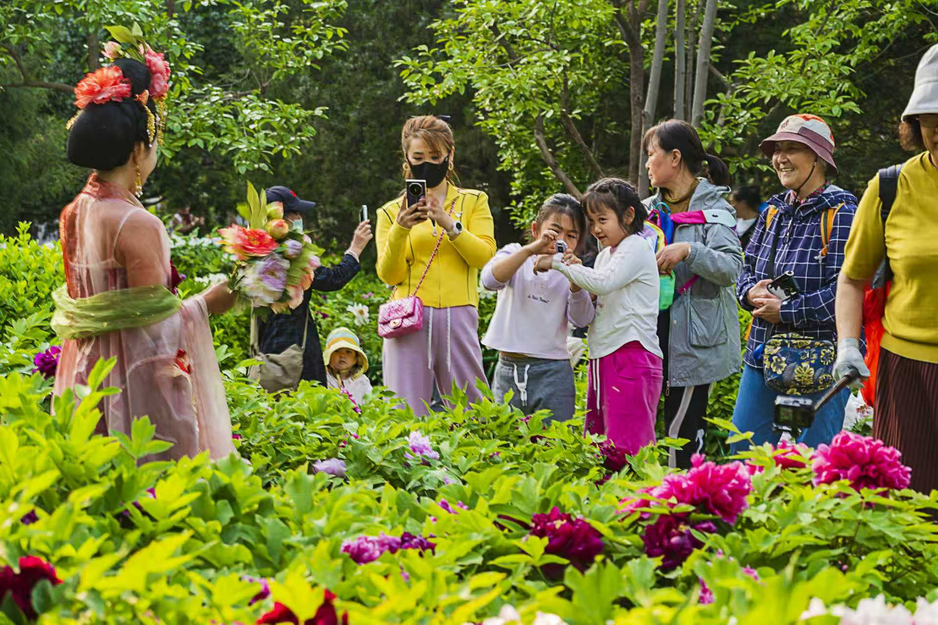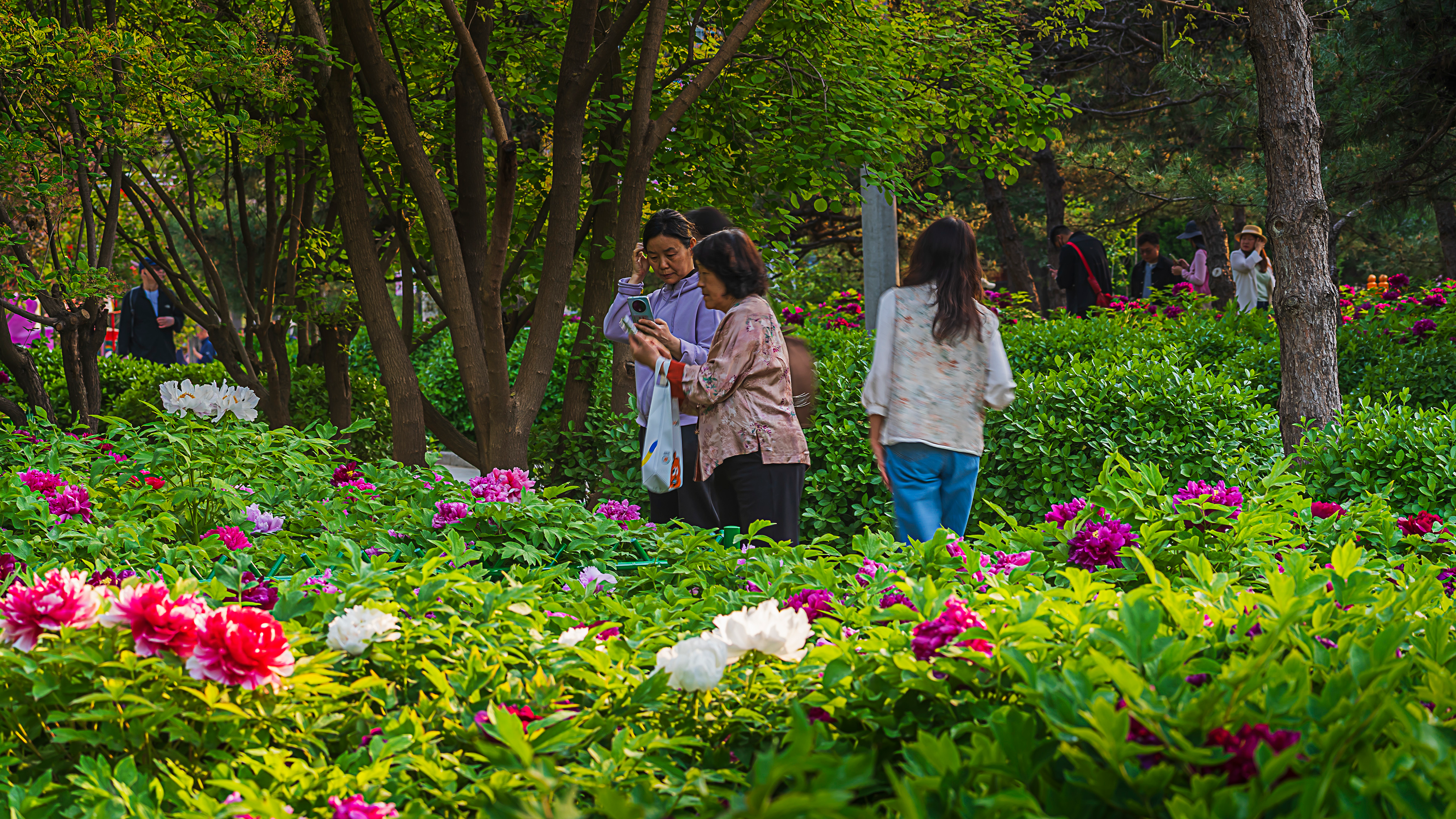 走进太阳宫公园的天姿牡丹园,这里的60亩牡丹花田花团锦簇、姹紫嫣红,5万余株牡丹涵盖九大色系,红若朝霞、粉似云霓、白如初雪、紫若烟岚,层层叠叠,呈现“九色同春”的美景,吸引了大批游客入园赏花休闲。