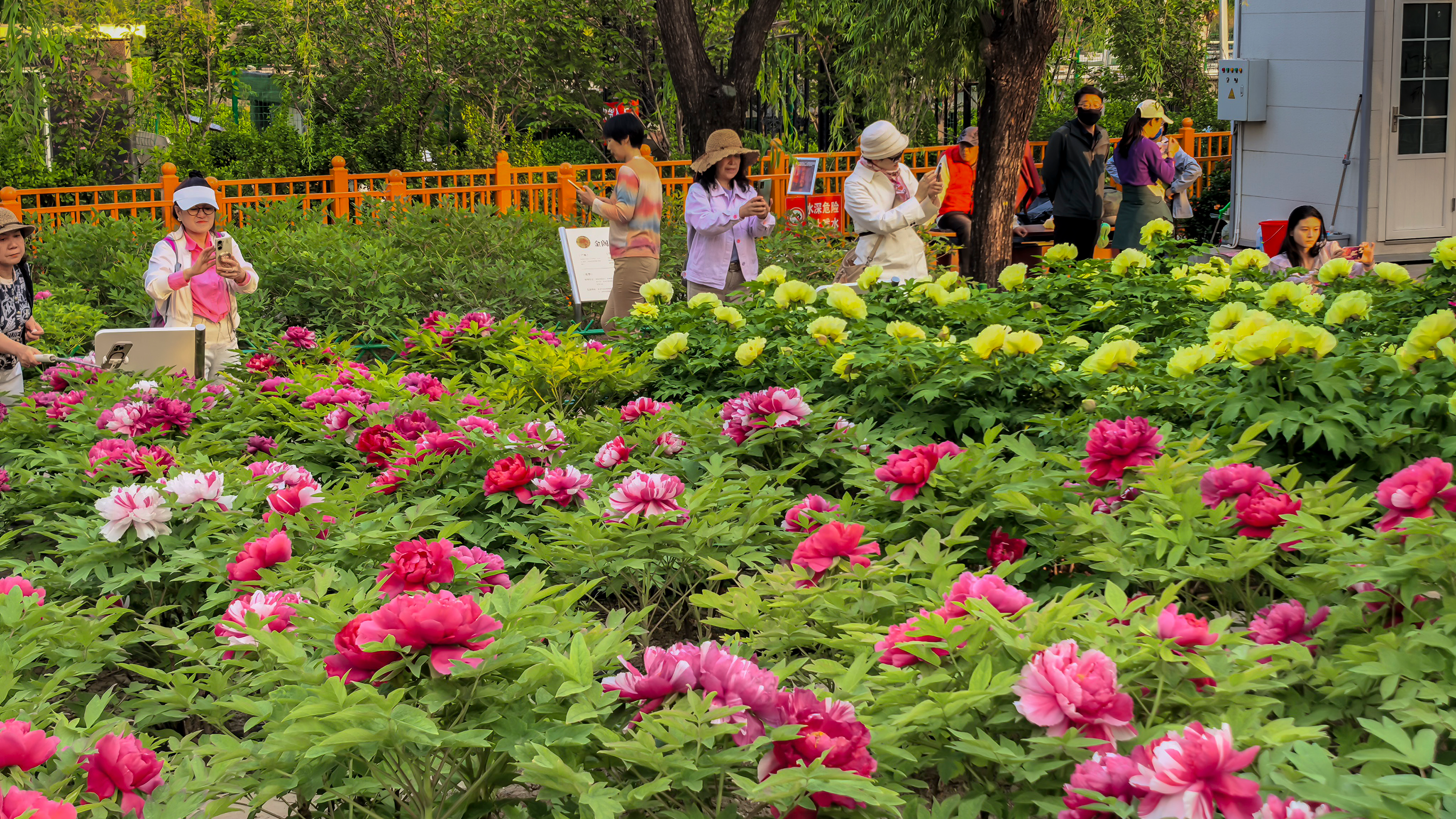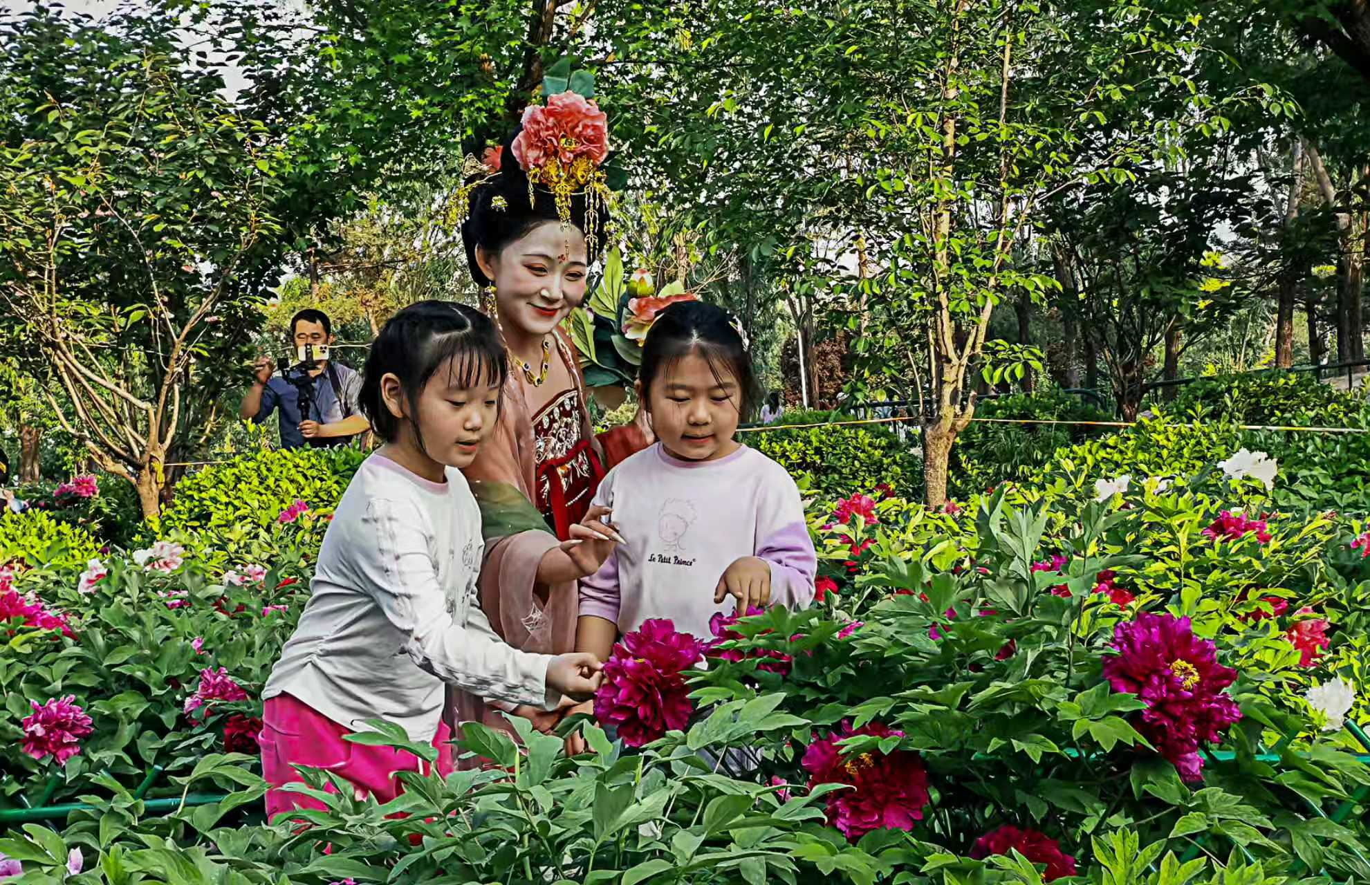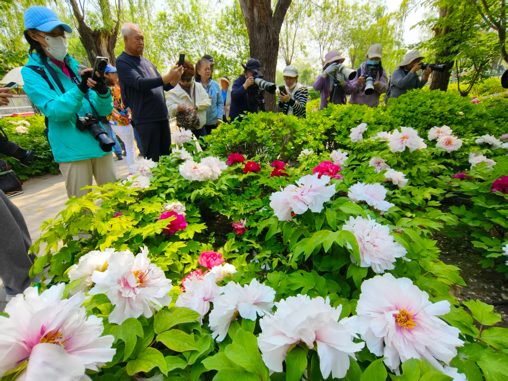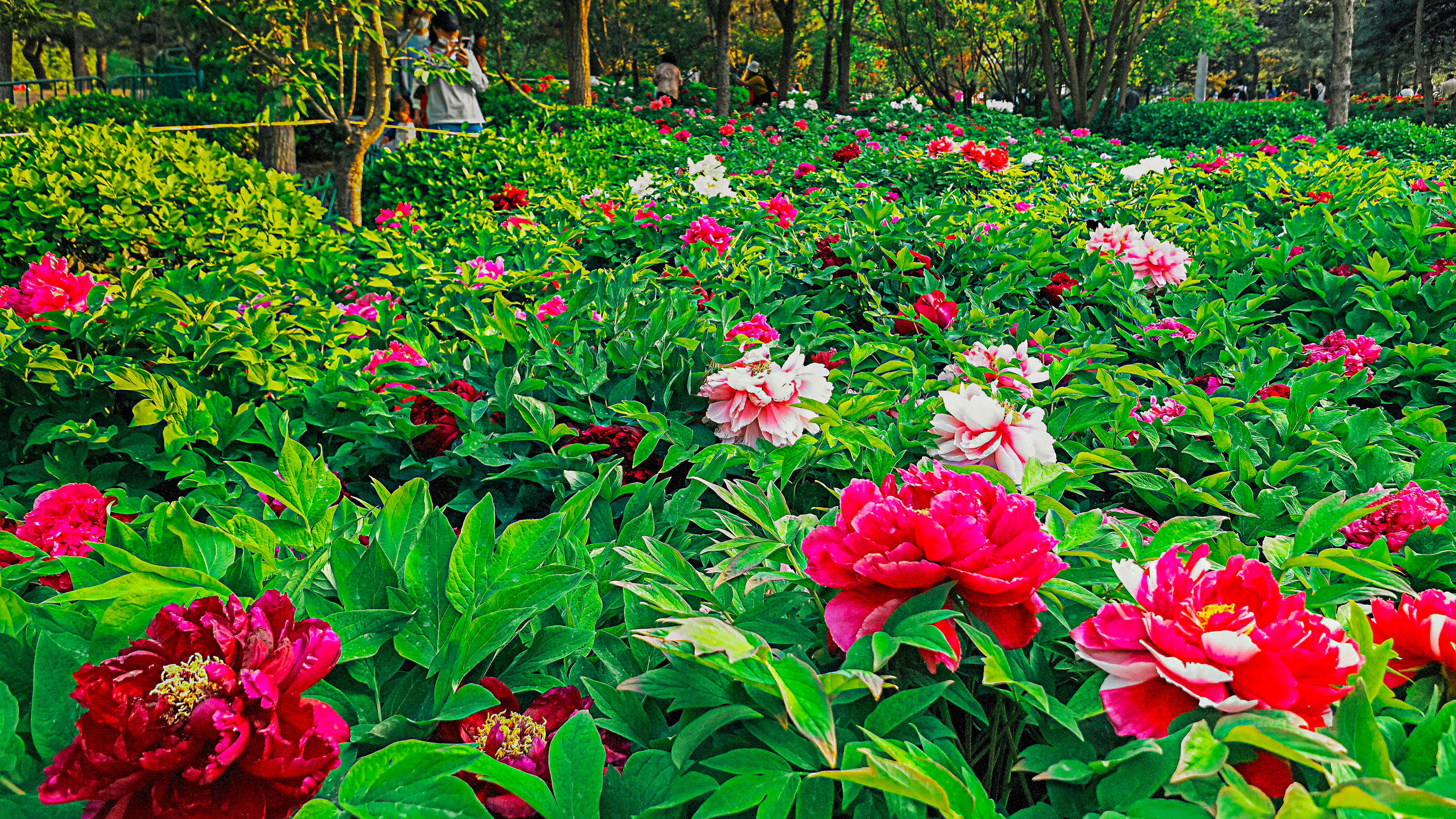 走进太阳宫公园的天姿牡丹园,这里的60亩牡丹花田花团锦簇、姹紫嫣红,5万余株牡丹涵盖九大色系,红若朝霞、粉似云霓、白如初雪、紫若烟岚,层层叠叠,呈现“九色同春”的美景,吸引了大批游客入园赏花休闲。