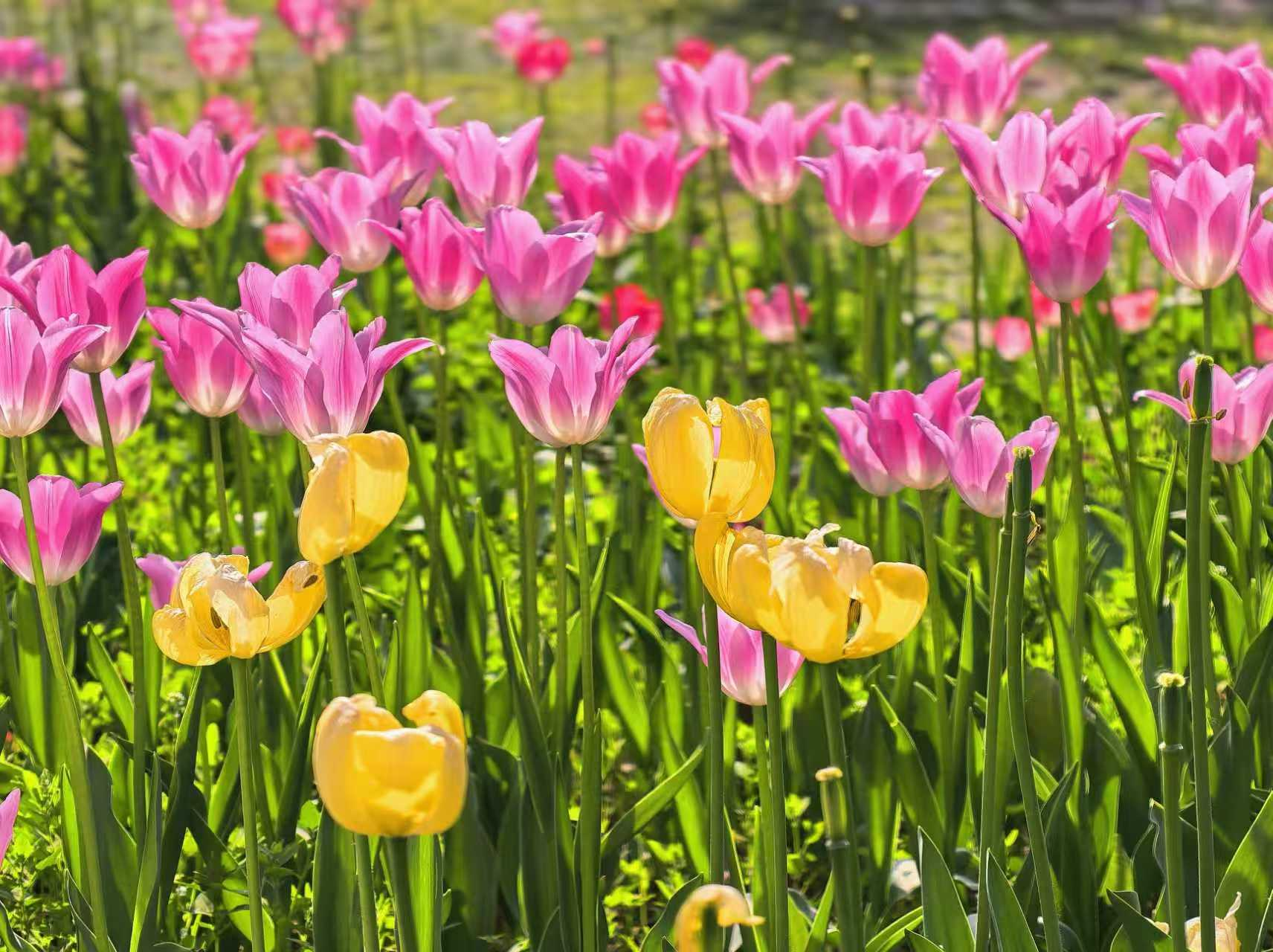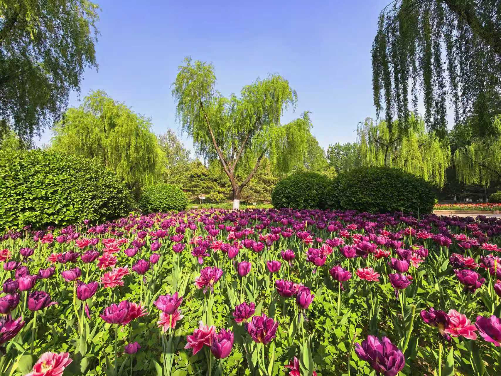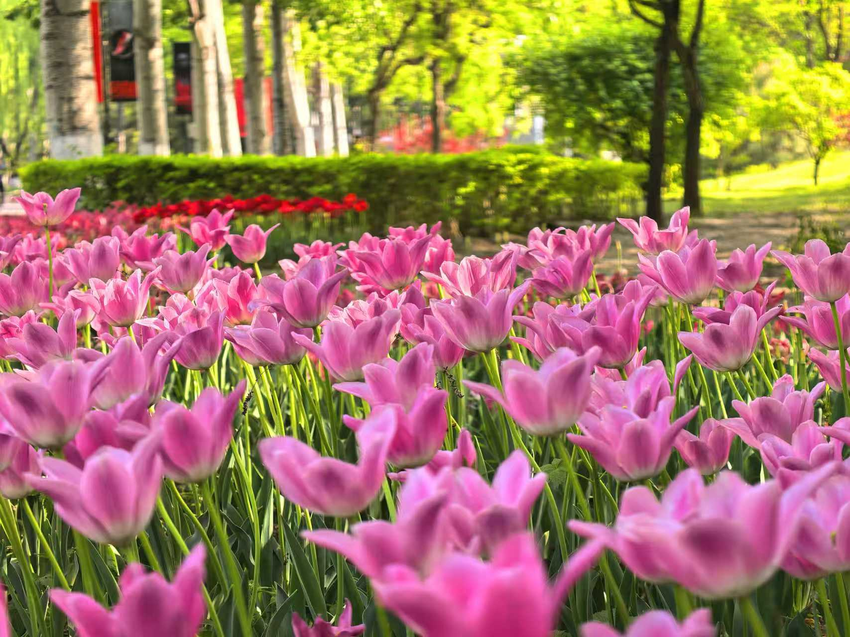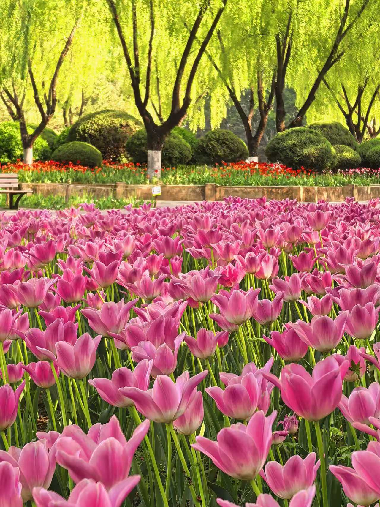 朝阳公园的郁金香,是春天打翻在人间的调色盘。绯红、鹅黄、绛紫,一朵朵举着酒杯,盛满了四月的阳光。风过时,花浪起伏,像大地在轻轻呼吸。如果你也恰好有空,不妨来走一走。不必刻意,只要站在花前片刻,便和整个春天“碰了一杯”。