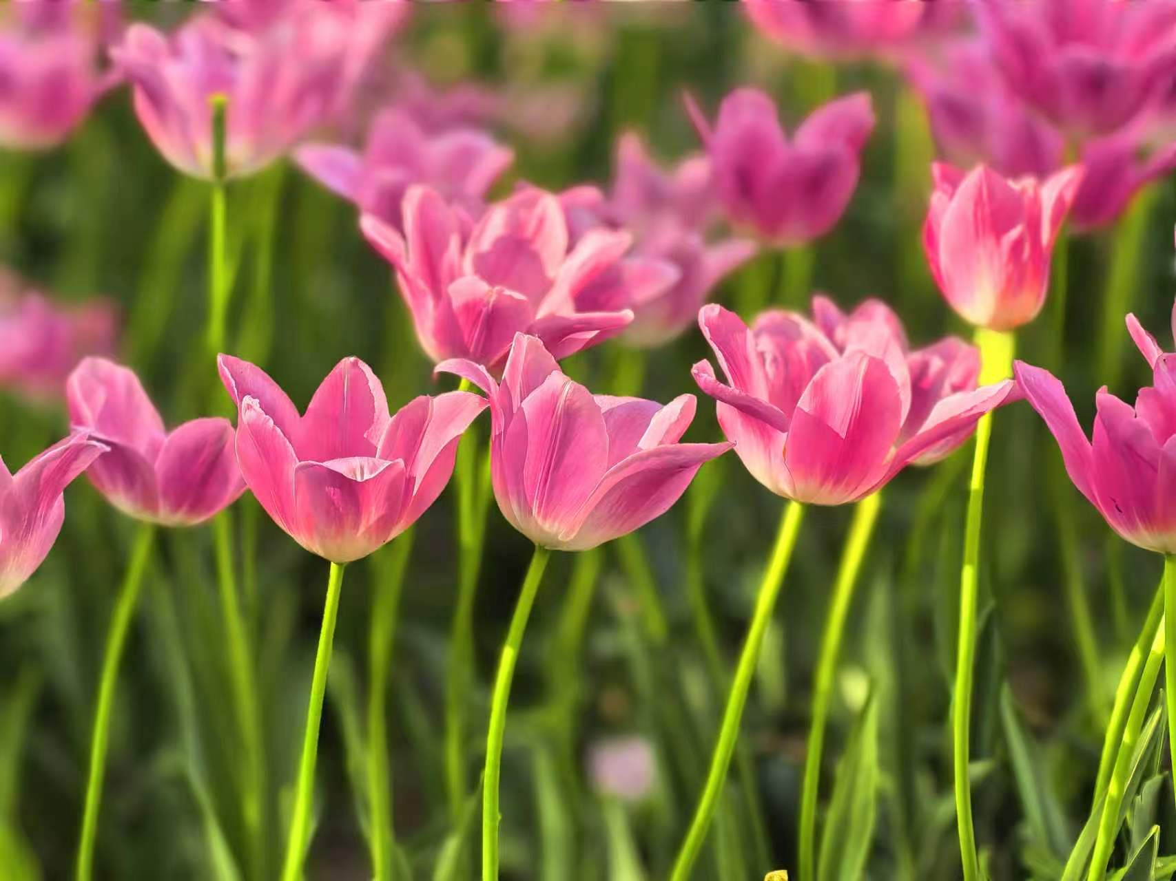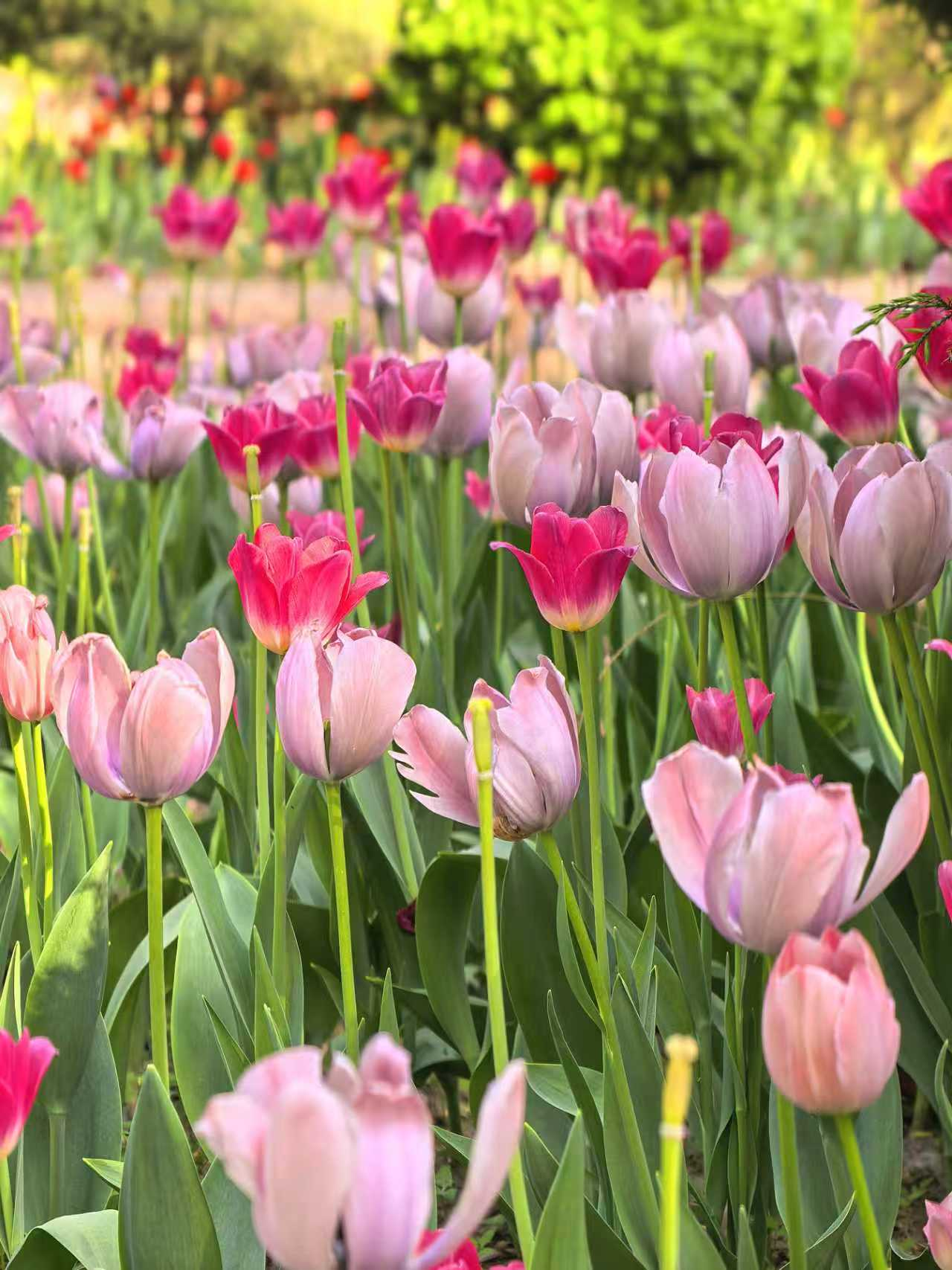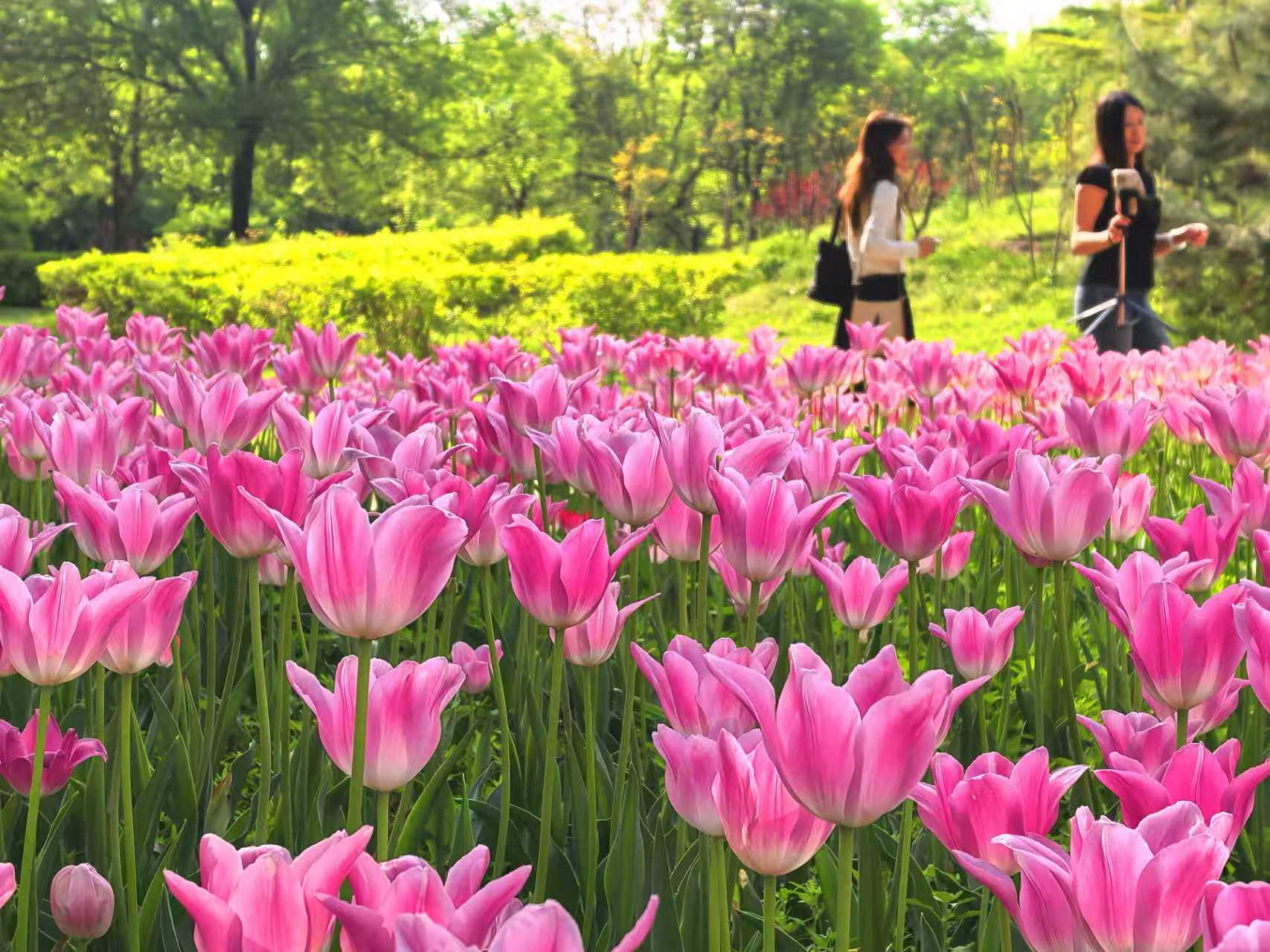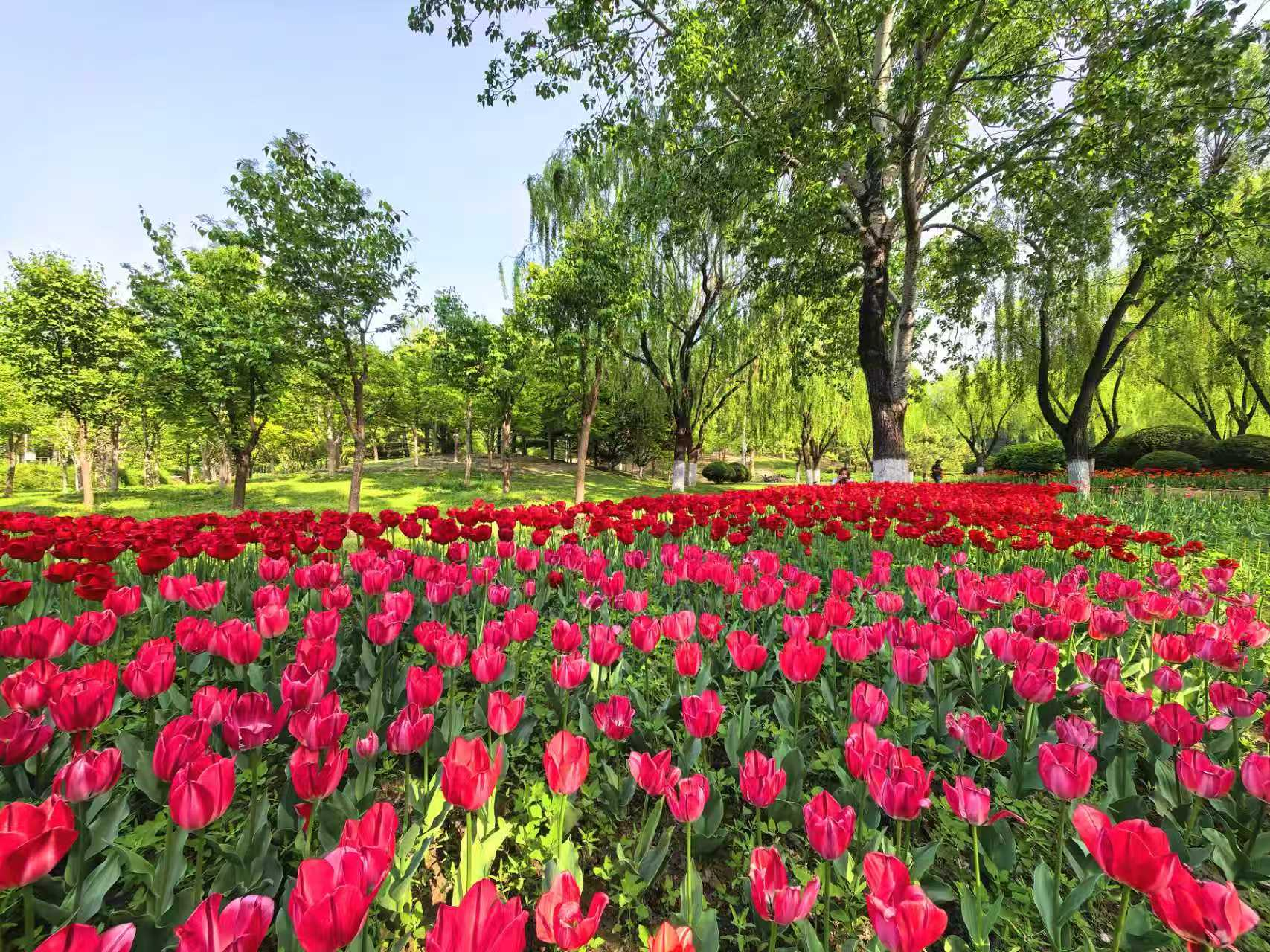 朝阳公园的郁金香,是春天打翻在人间的调色盘。绯红、鹅黄、绛紫,一朵朵举着酒杯,盛满了四月的阳光。风过时,花浪起伏,像大地在轻轻呼吸。如果你也恰好有空,不妨来走一走。不必刻意,只要站在花前片刻,便和整个春天“碰了一杯”。
