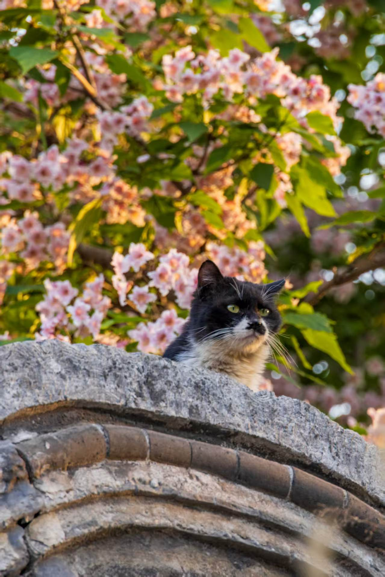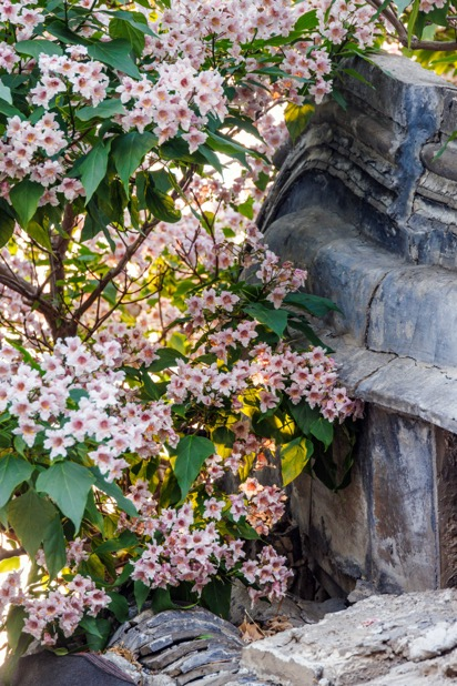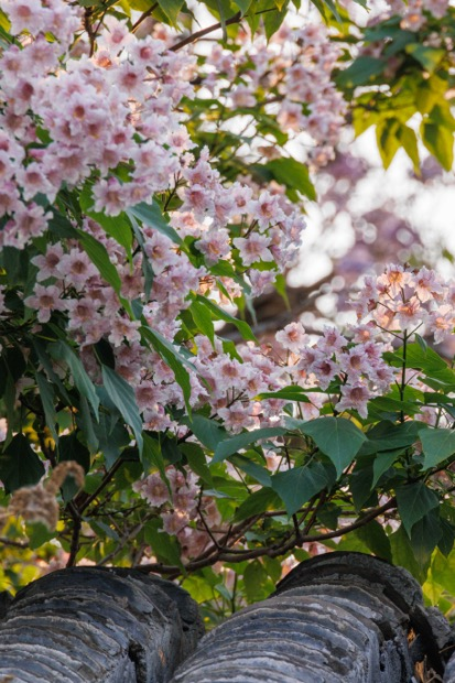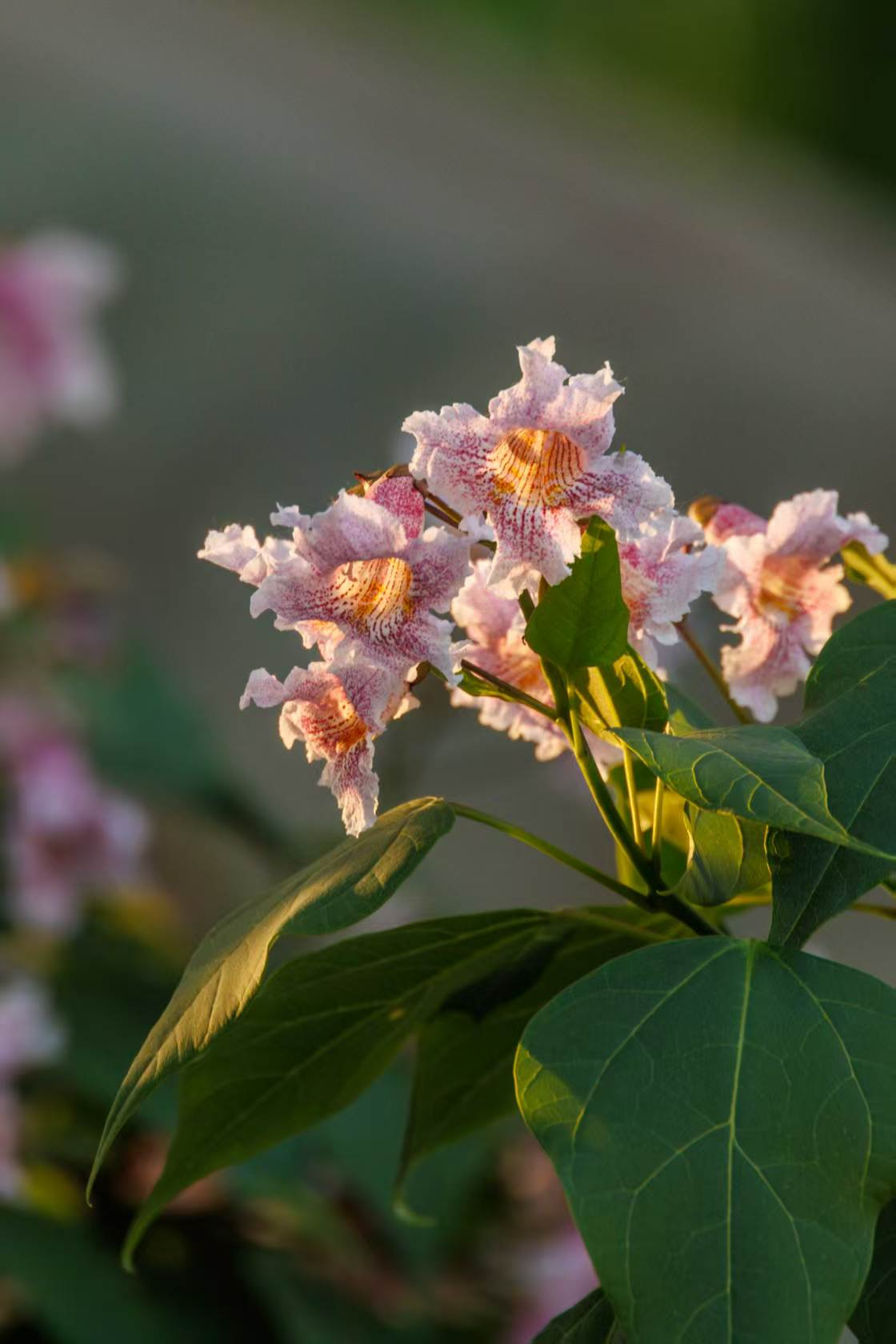 楸花是淡粉带紫的温柔模样,花瓣里藏着细碎的紫斑,风一吹,粉白的花簇就像瀑布一样从老树枝丫上垂落。