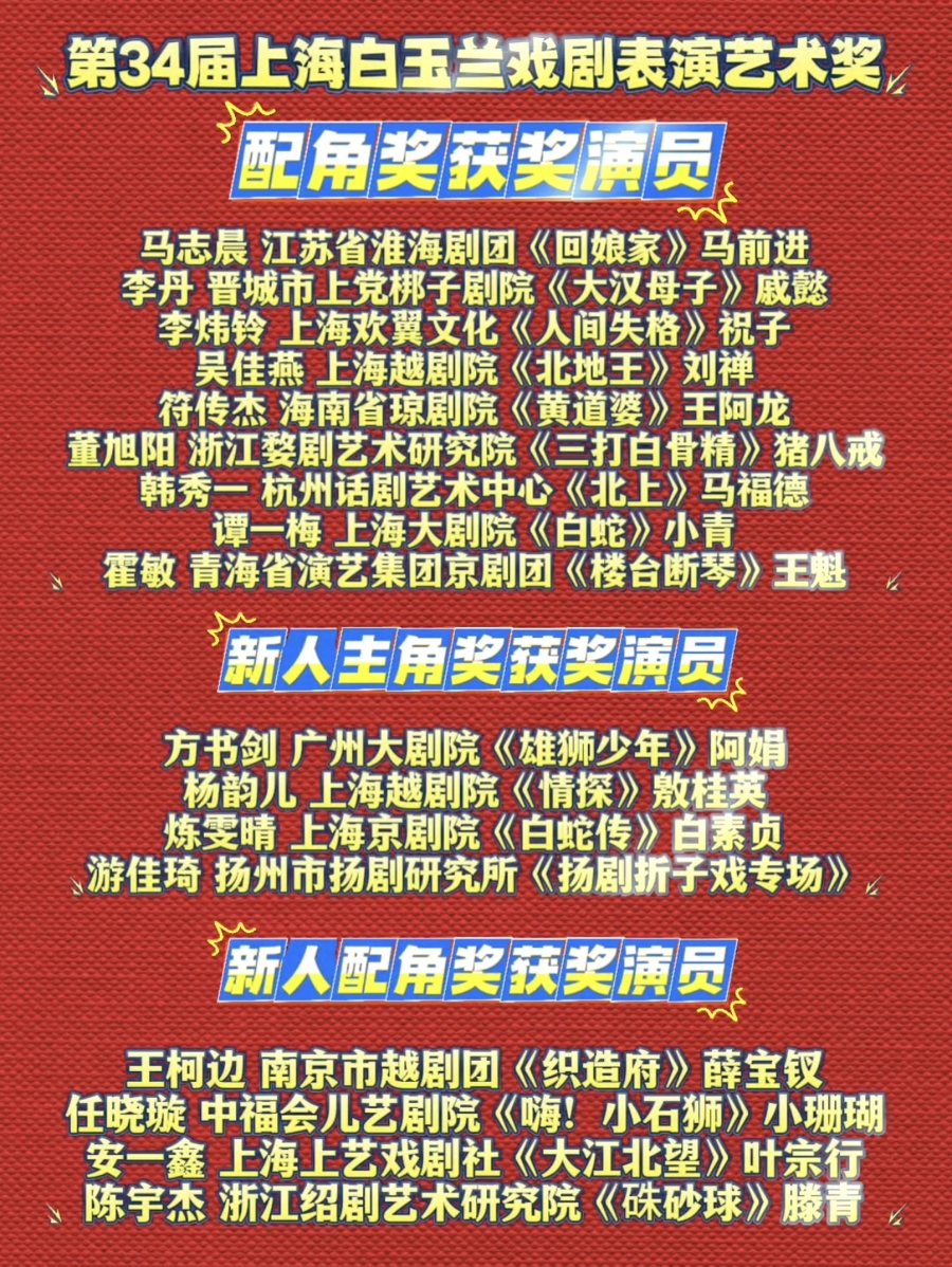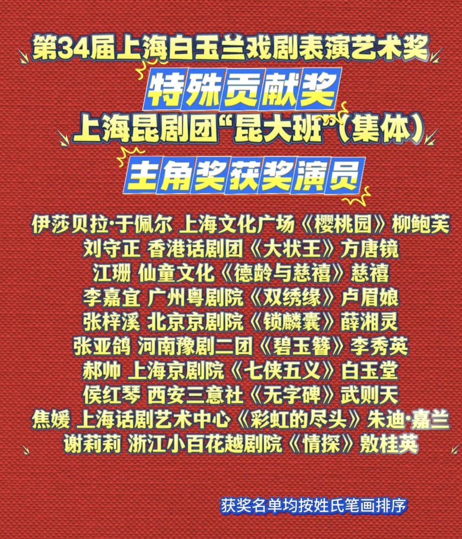 4月24日,第34届上海白玉兰戏剧表演艺术奖获奖名单在上海文化广场揭晓,伊莎贝拉·于佩尔、江珊等10位演员获得主角奖,霍敏等9位演员获得配角奖,方书剑等4位演员获得新人主角奖,王柯边等4位演员获得新人配角奖。