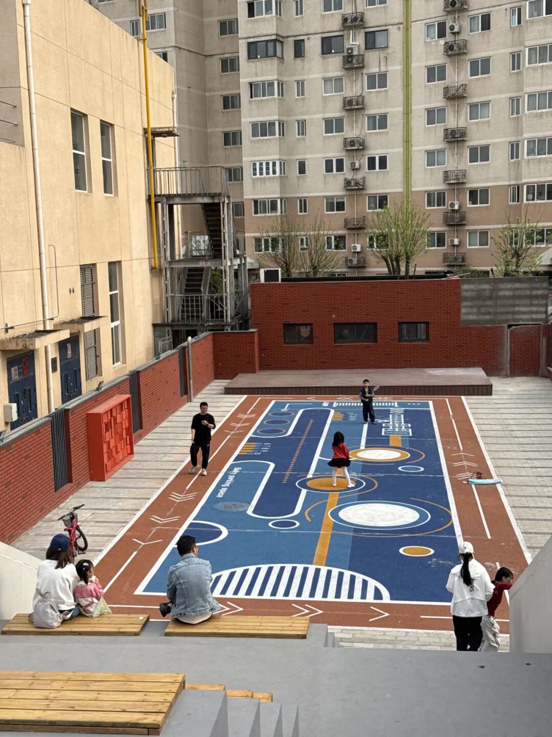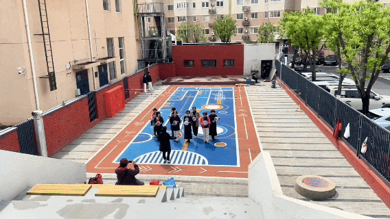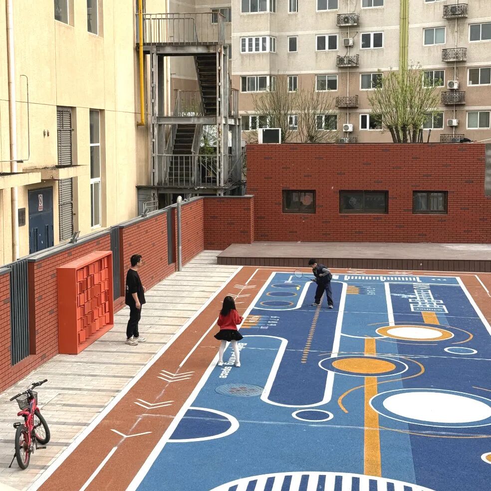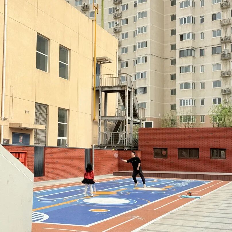 人气最高的当属室外运动区域。地面铺设软橡胶,清晰标注了各类运动功能辅助线,兼顾安全性与实用性。年轻人在这里打羽毛球,中老年居民伴着音乐排练模特走秀,儿童也有了安全跑跳的空间……不同年龄段的居民各得其所、乐享其中。
