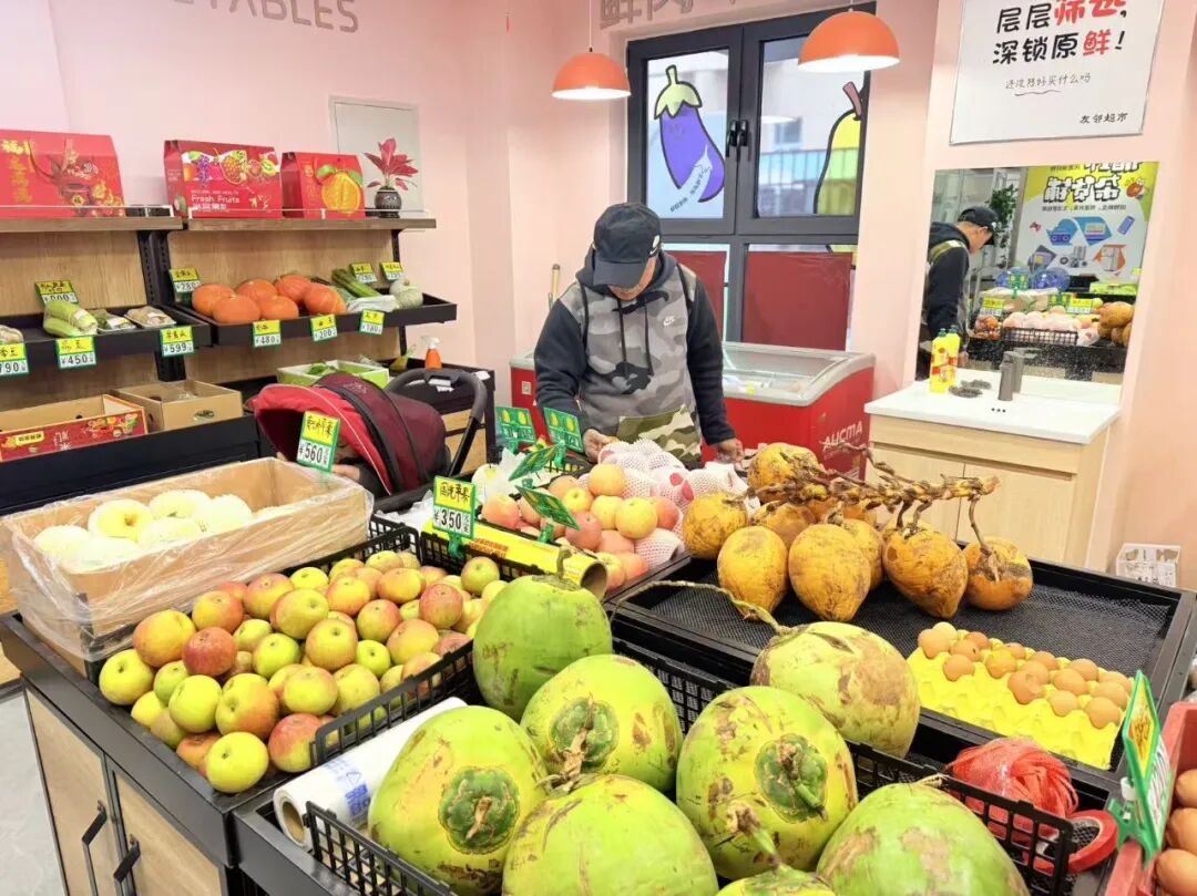 友邻超市里商品琳琅满目,工作人员热情介绍,“从肉蛋菜奶到日用百货应有尽有,我们就是为了最大程度方便居民足不出社区,就能就近买到生活所需。”店里还提供了内蒙羊肉、海南百香果等特色食材,为居民提供差异化选择。
