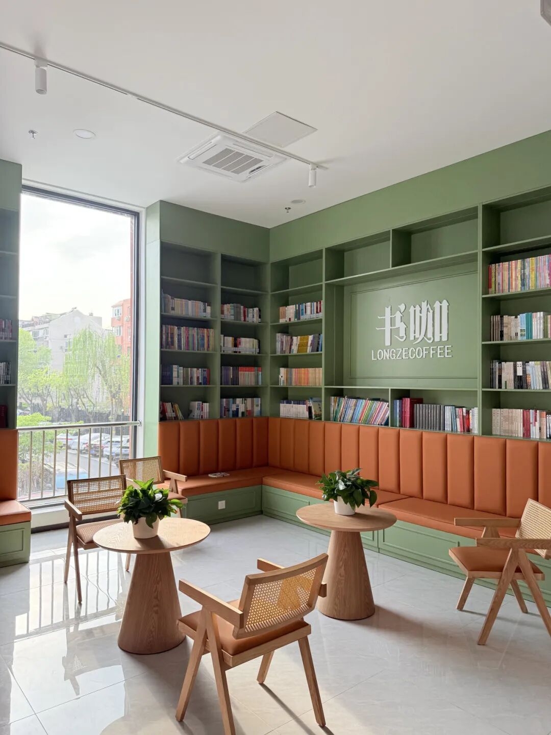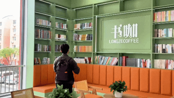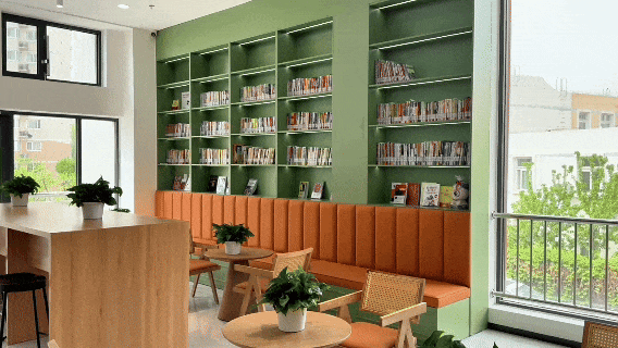 另一边的书咖则成为了年轻人争相打卡的网红机位,清新的果绿色与原木色的装修风格,一改传统冰冷的灰白色调,洋溢着年轻的现代气息。正值四月,落地窗外满目翠绿,坐在靠窗的位置捧书阅读,阳光倾泻而下,是一种独一无二的享受。