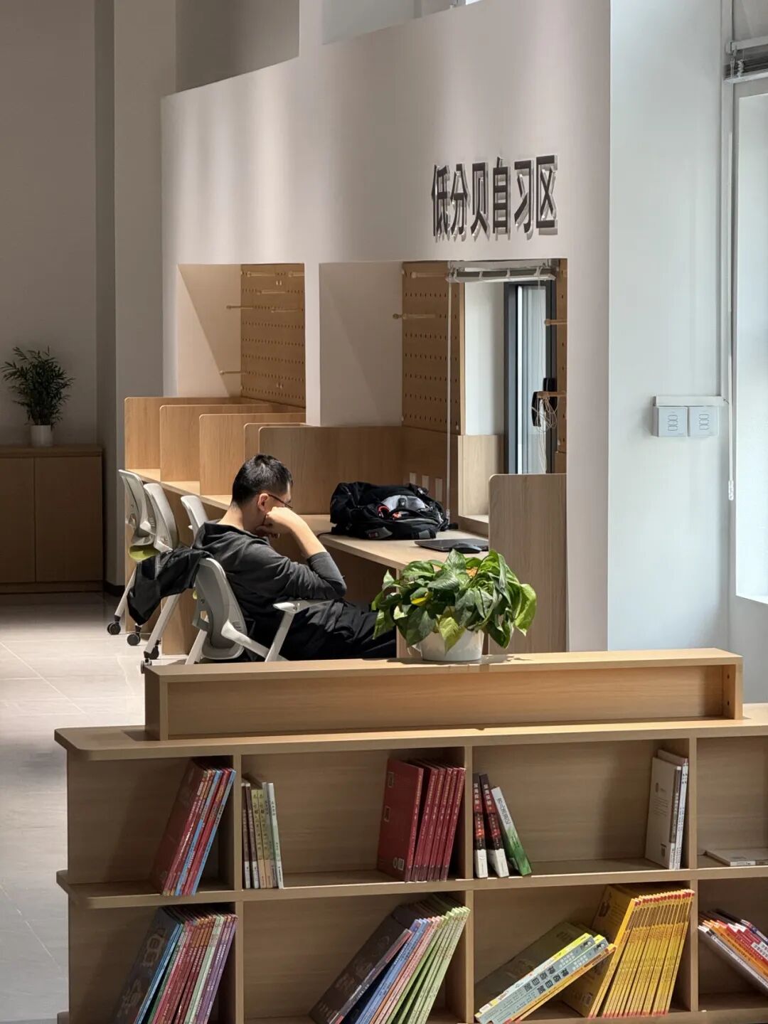 二层的座位形态多样且位置充足,充分考虑到不同人群的刚需。在低分贝自习区,舒适的工学椅上还贴心装有静音滑轮。“我现在读高二,学习正紧张,周末总要跑到远处去自习很费时间。最近发现,家门口的自习室就很舒适。”就读于北京市第一六一中学回龙观学校的闫同学连连点赞,“学累了,下楼就能去社区食堂吃饭,太方便了,以后会经常来。”