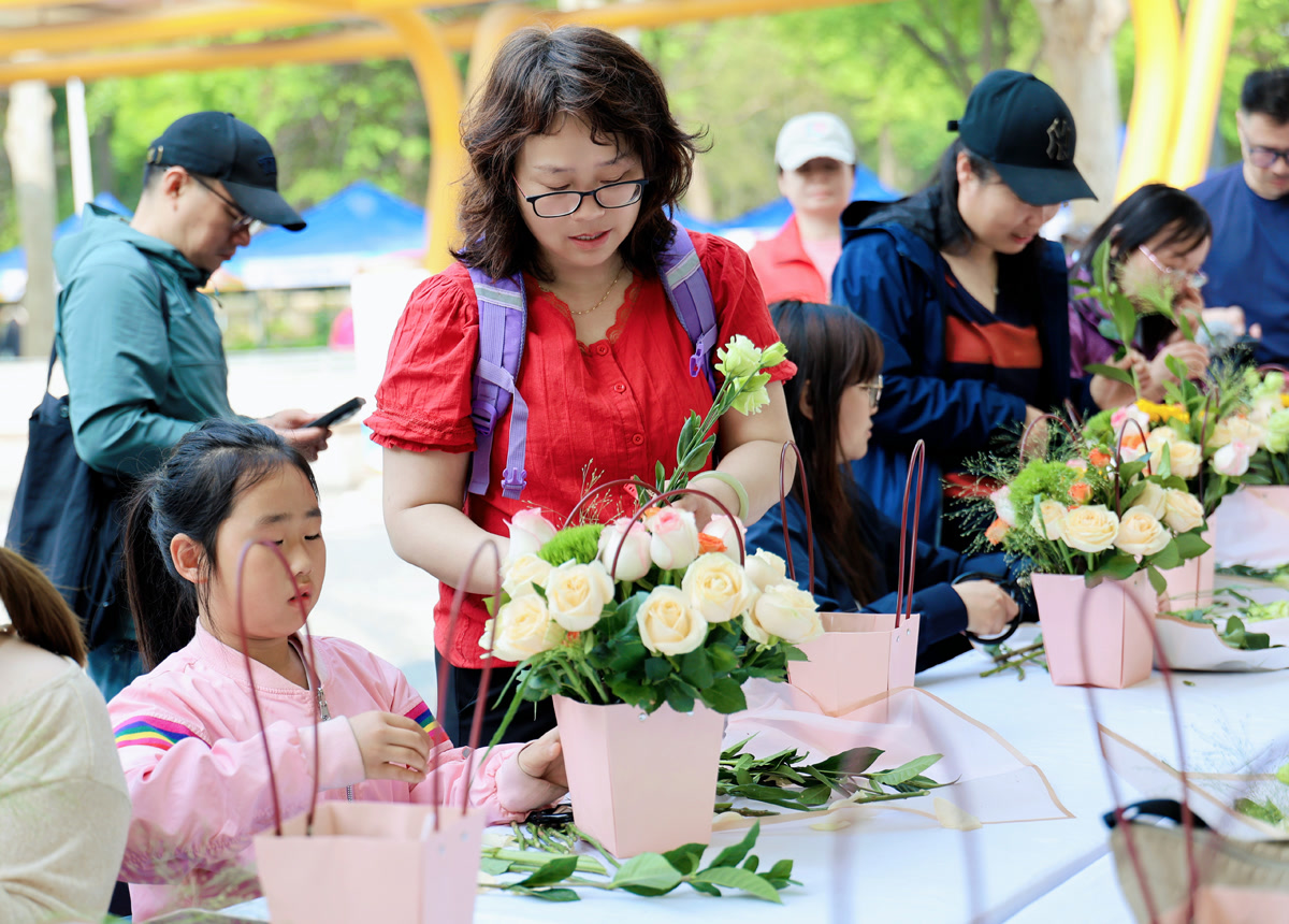 一旁,插花体验区域则安静温暖,妈妈们带着孩子修剪枝叶、搭配色彩,在运动中寻得一刻从容与美好。这正是“健康中国 母亲行动”对女性身心健康的温柔关照。