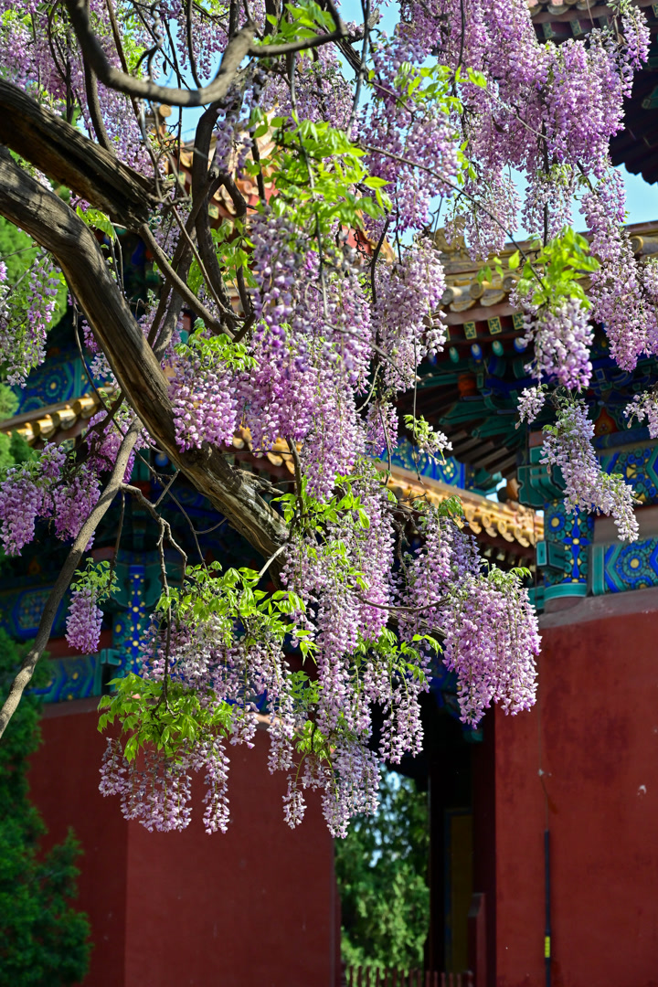 孔庙二进院,一串串深浅不一的紫色花穗如瀑布倾泻而下,背景是红色院墙,美不胜收。不少观众专程奔着这份浪漫来参观。摄影爱好者张先生几乎每年来拍该馆紫藤,对花事了然于心。他在“紫色瀑布”里支起机位,边拍边给其他观众讲解:“大成门两侧的紫藤开得最茂盛,适合在树下拍。再往里走,大成殿旁还有两株,可以拍到紫藤映古建的画面。旁边,国子监院里的紫藤也别有韵味。”