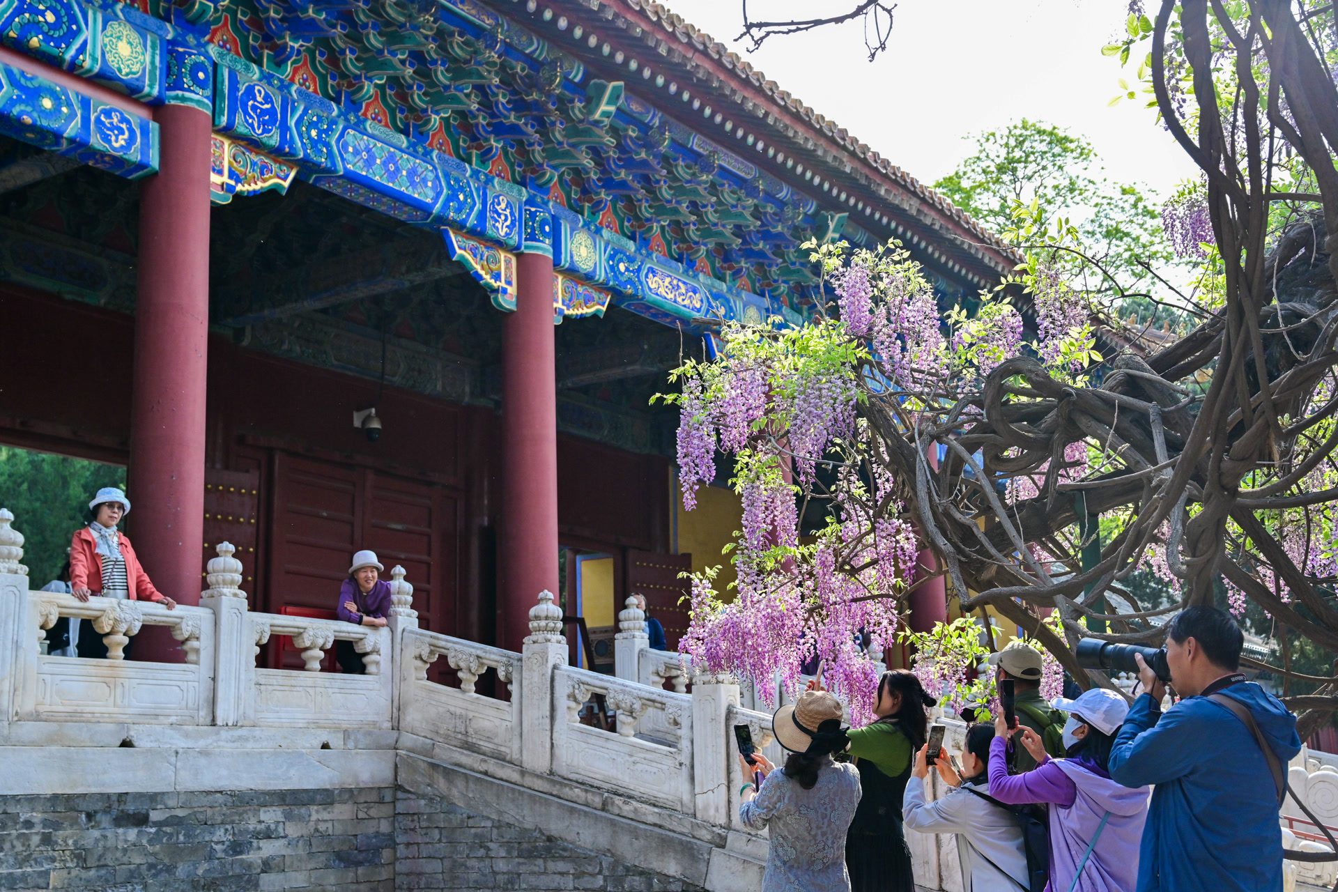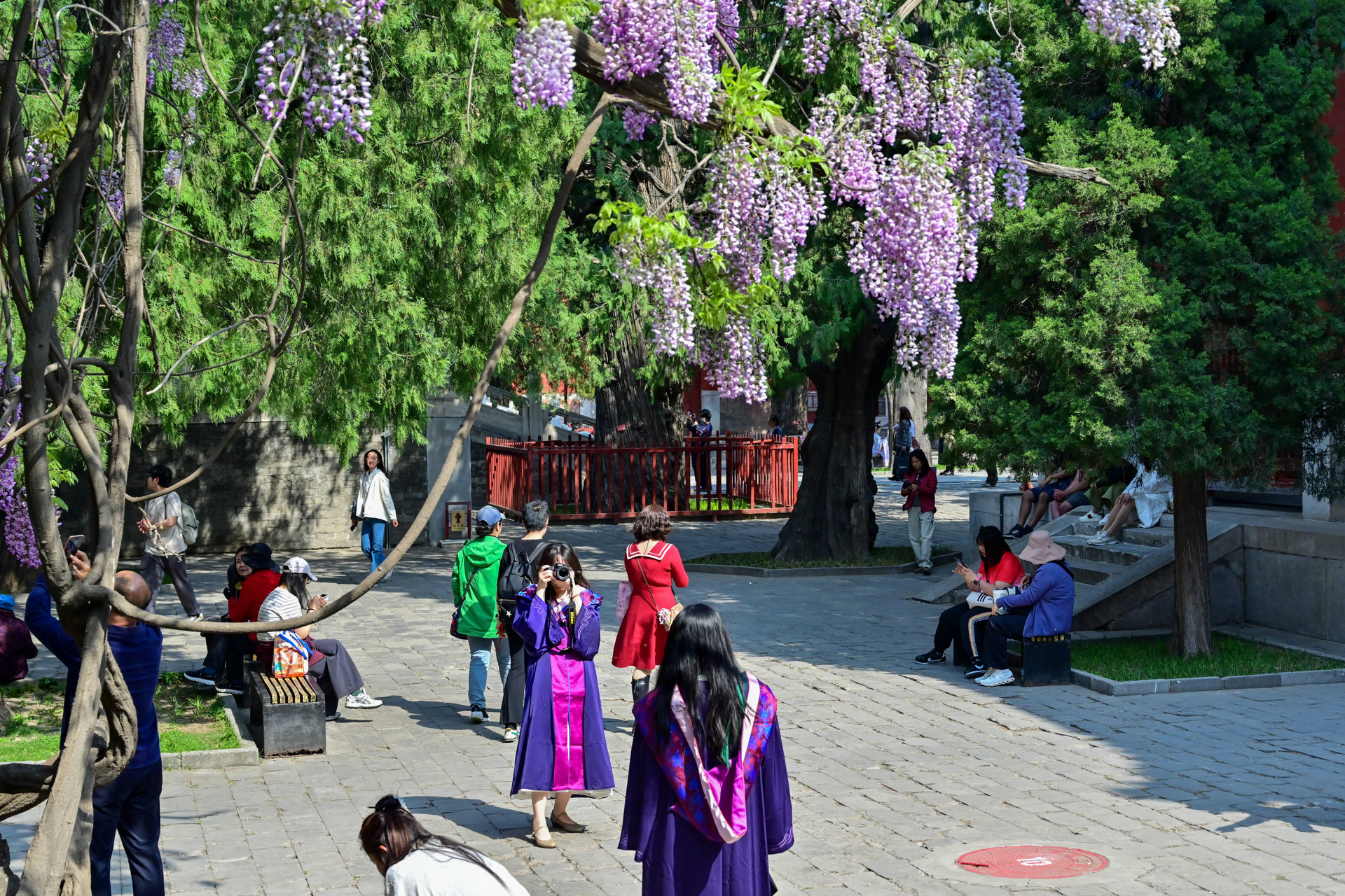 孔庙和国子监始建于元代,合于“左庙右学”的古制,分别作为皇帝祭祀孔子的场所和中央最高学府。两组建筑群都采取沿中轴线而建、左右对称的中国传统建筑方式,组成了一套完整、宏伟、壮丽的古代建筑群。每年紫藤花开,尤其会吸引学生群体打卡拍照。小韩身着学士服在紫藤花下摆造型,同伴举着手机连按快门。她说:“我们6月就要毕业了,特意来这里拍毕业照,有一种被花海和书卷气包围的感觉。随手一拍都是大片,氛围感拉满。”