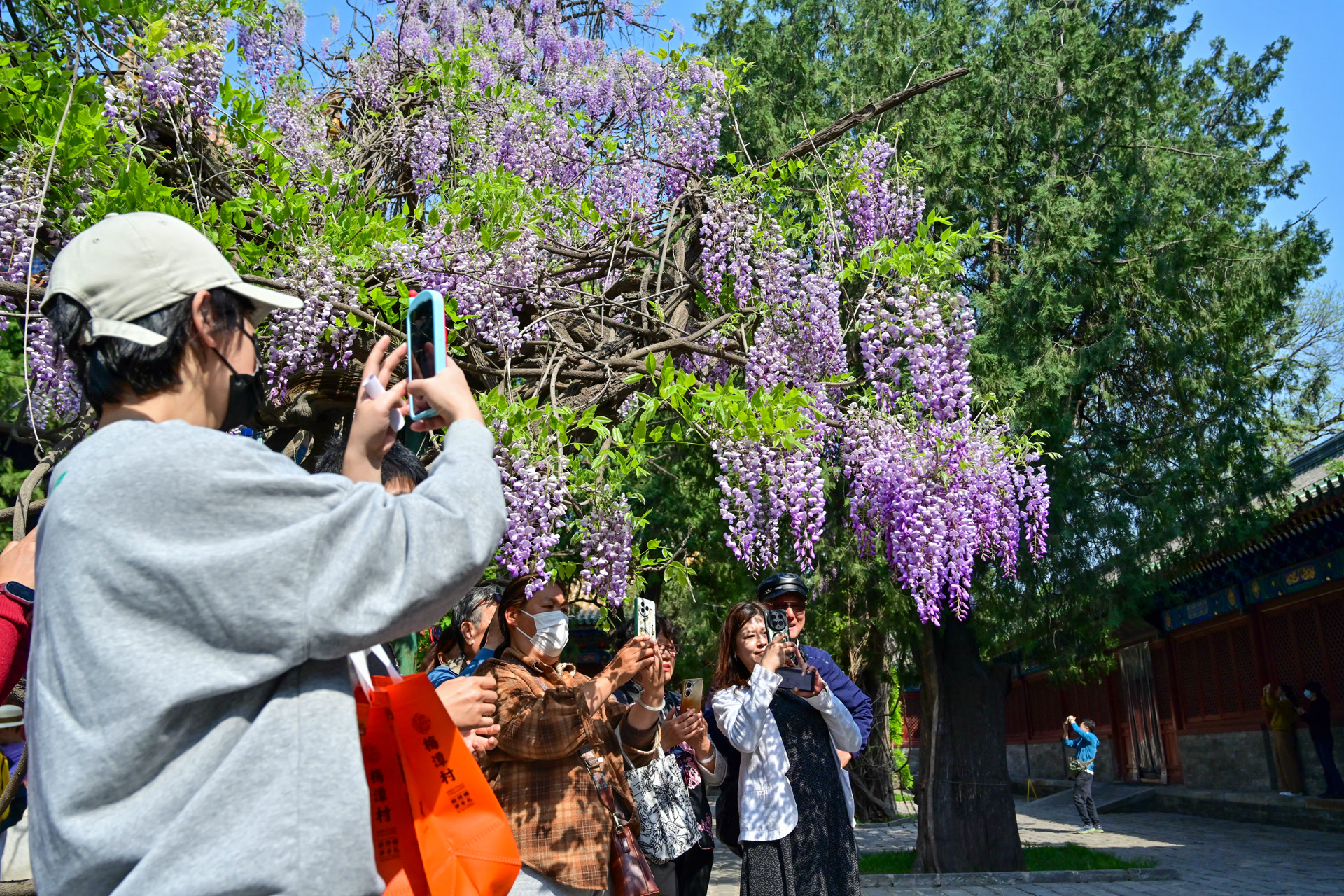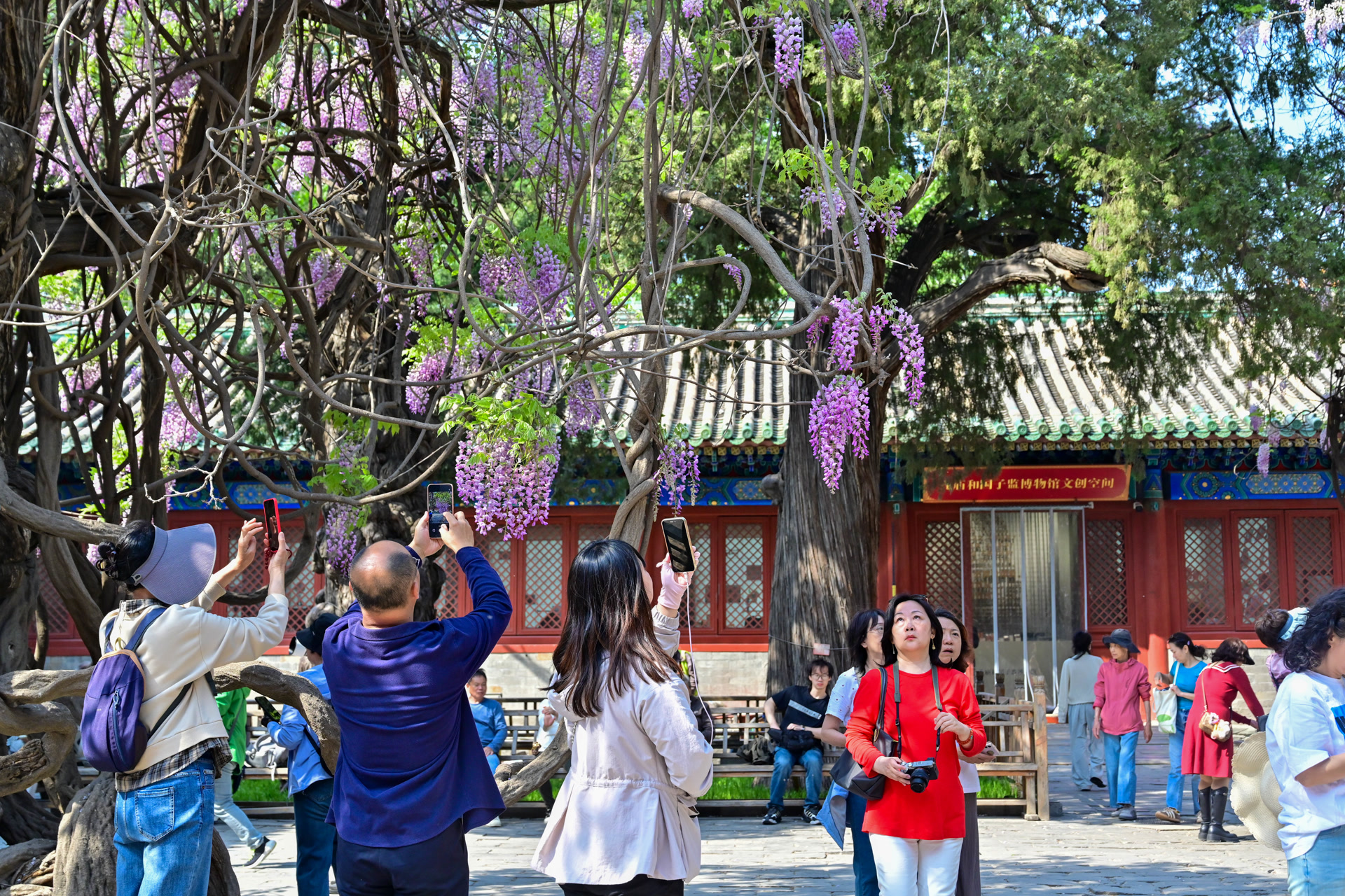 为了回应观众热情,孔庙和国子监特别推出了“紫藤地图”,清晰标注了两座院内每株紫藤的位置和花期信息,方便观众按图索骥。观众王婷和同伴来自武汉,她说:“正巧赶上了紫藤季。我们对照着地图打卡,解锁了很多宝藏机位。这趟旅行非常尽兴。”