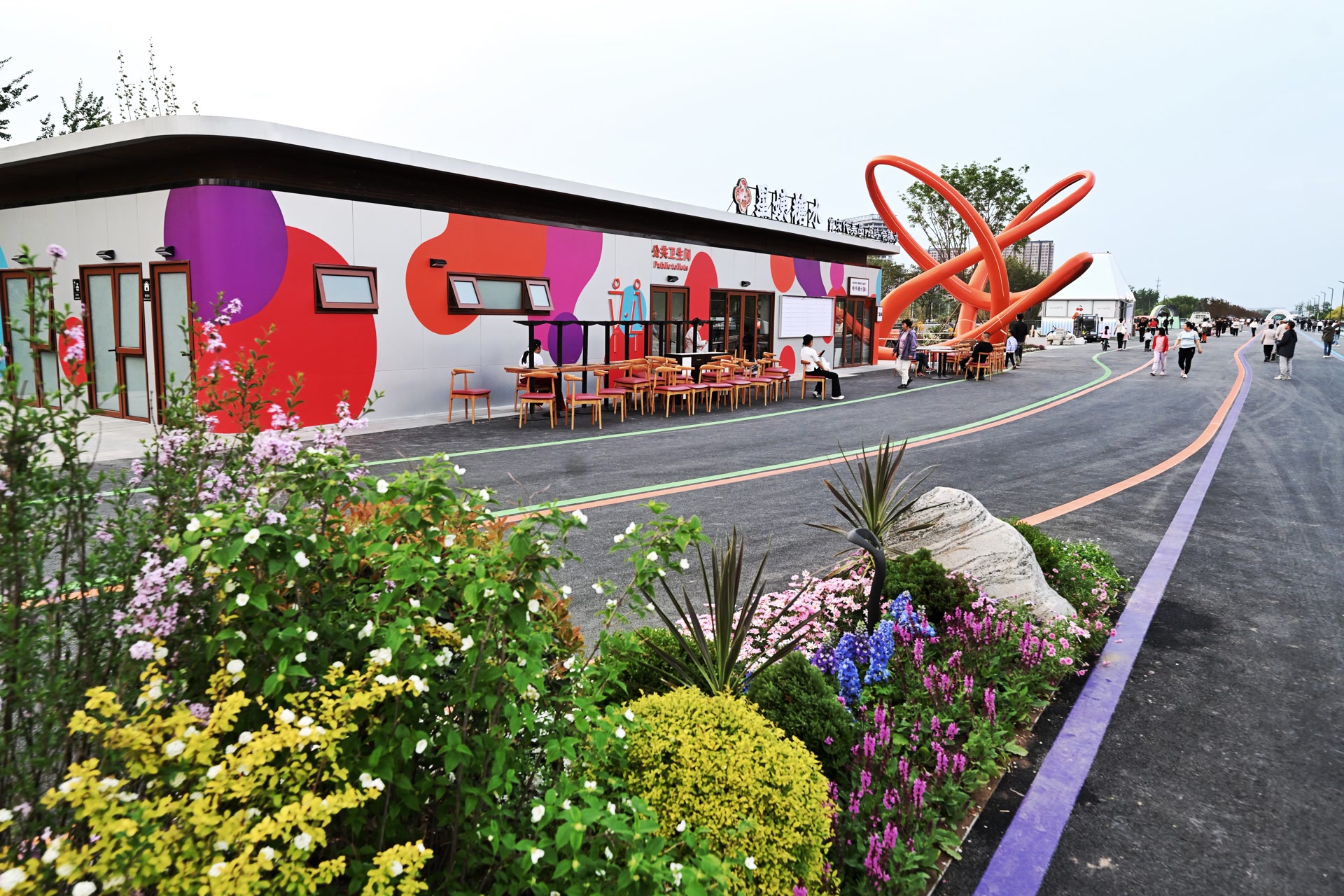 从首都公共艺术创作基地拾级而上,便来到这处由原六环路改造而成的空中城市花园,蓝、紫、橙、绿四种彩色分割线划分出漫步道、跑步道、游览车道等慢行道路。步道间,由雏菊、月季、鸢尾、绣球等组成的景观小品生机盎然,不少市民游客已经提前到这里尝鲜体验。