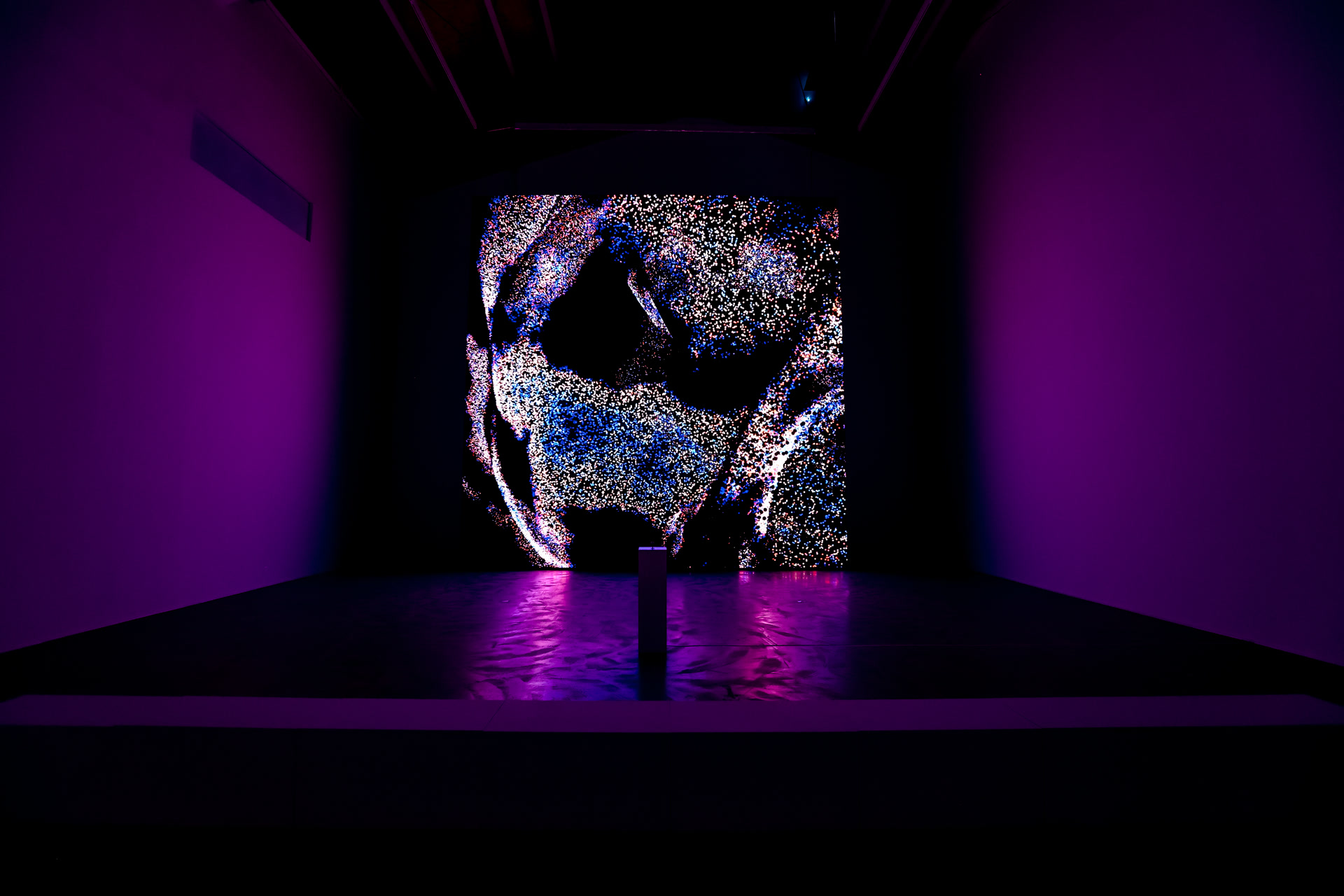 近20年来,艺术家马克西姆始终以数字探索世界生成背后的底层规律。作品中,他以构筑者的身份设定物理规则,如重力、磁场、碰撞、流体动力学等,将建筑、雕塑与自然算法融合,赋予其生命力,让数亿个数字微粒在模拟空间中化为无限变幻的自由浮流,形成极具个人代表性的“粒子动力学美学”。