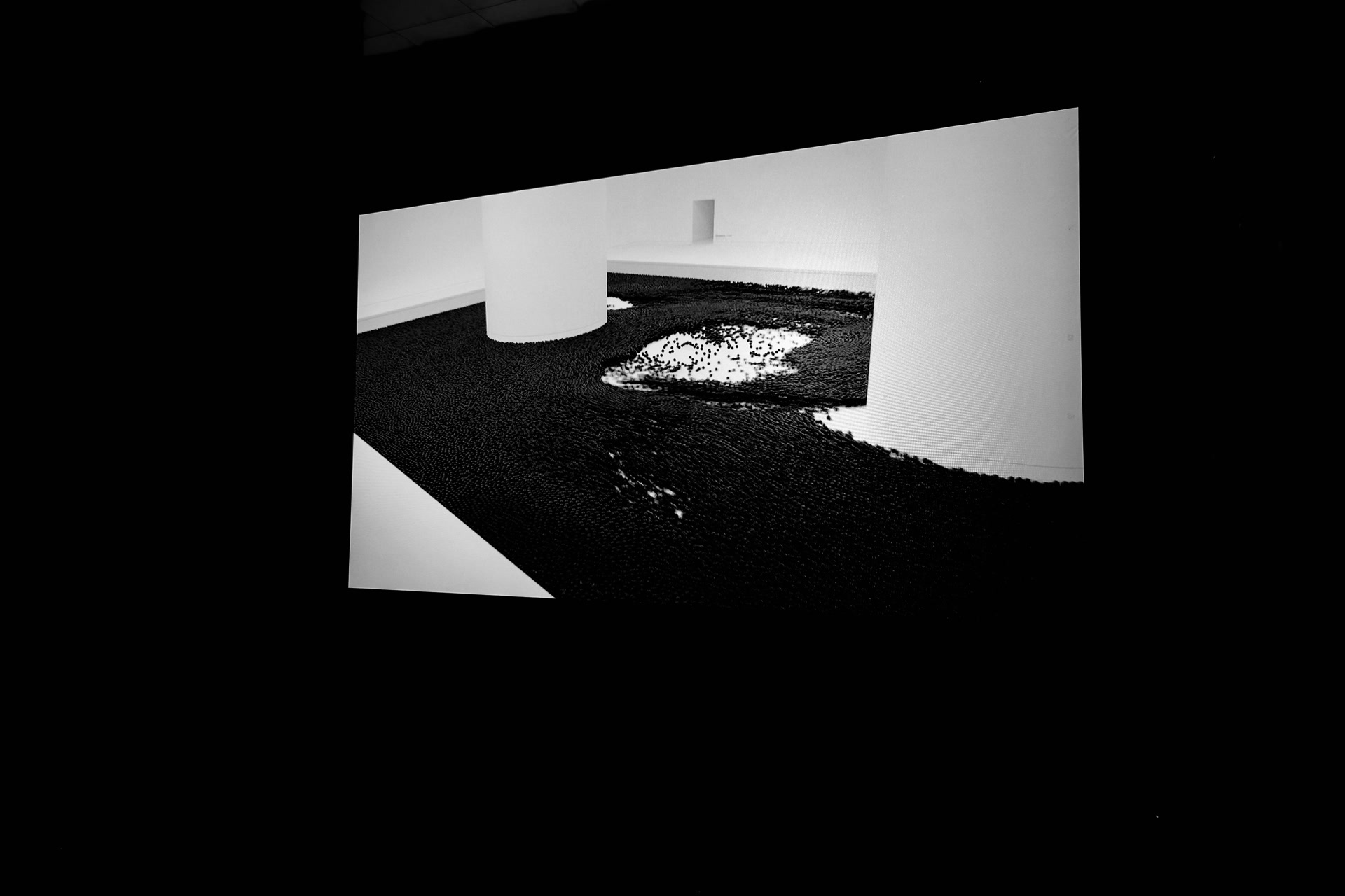 此次展览中,《体积》以色彩的涨落模糊了人造与自然,令人思索真实与虚拟、有机与无机的边界,成为展览的前奏。步入核心展厅,7x7米巨型LED屏幕呈现的交互装置《游境》让观众化身为宇宙的探索者,穿越于四个抽象生物群落。在VR项目《模块》中,观众将参与新世界的探索与共造,预演人类与数字主体的共存。最终,《元素》将一切纷繁归于黑白粒子。