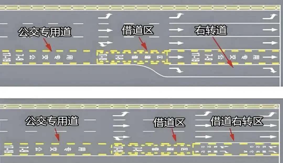 此外,对于公交专用道借道区的使用,此次优化调整进行了重申和强调,转弯车辆可通过公交专用道施划的借道区标线进出道路,行经该区域时应迅速驶离,不应在该区域停车;非转弯车辆不应使用借道区。