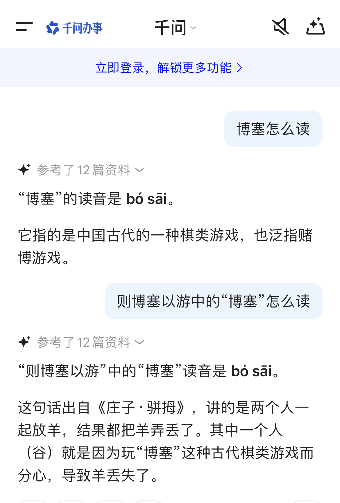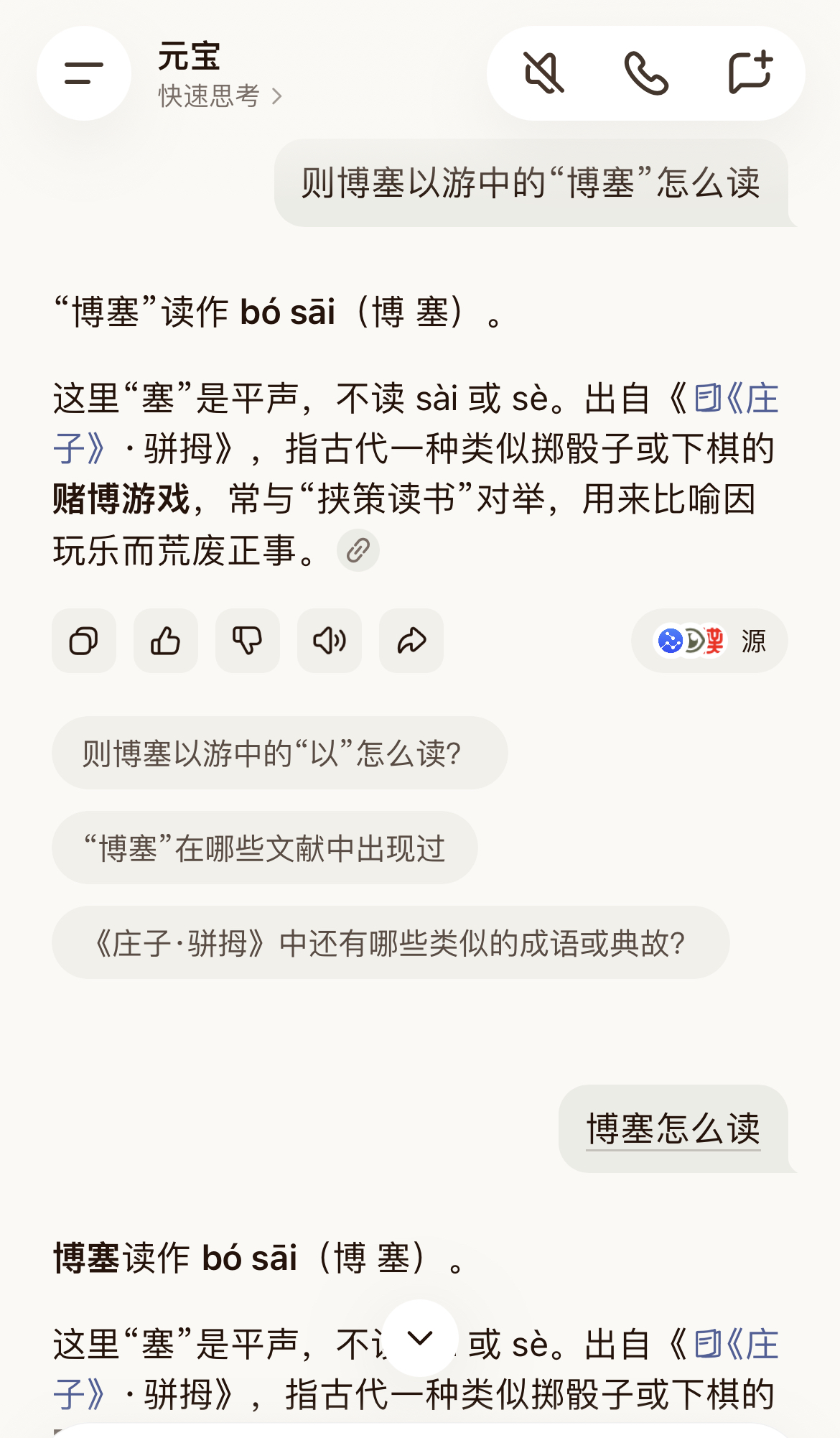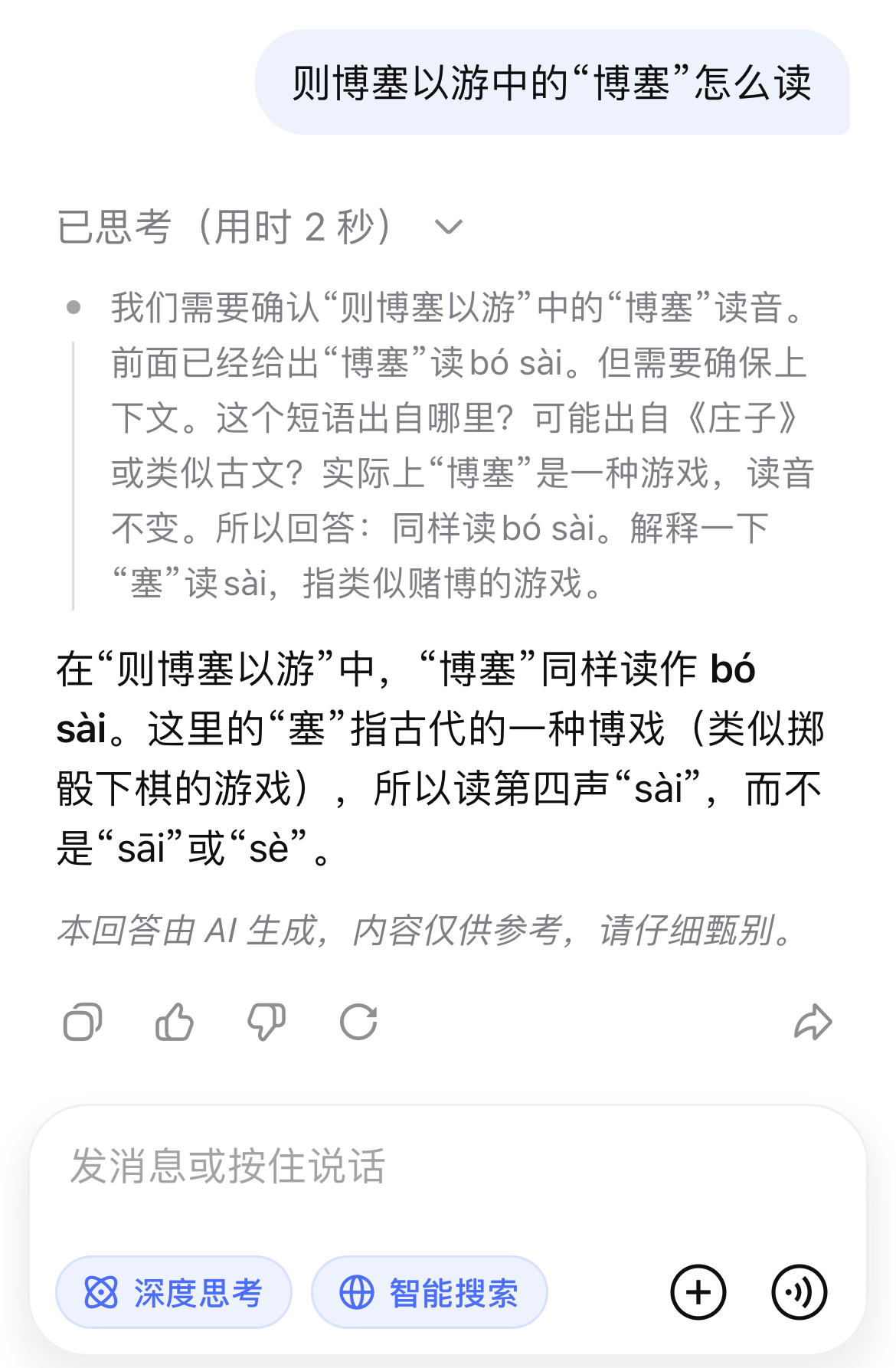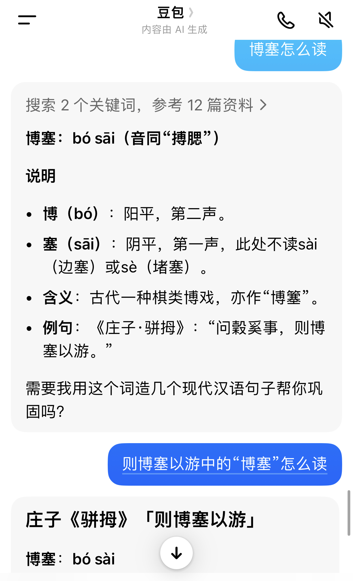 她连看都没看一眼书桌上的字典,而是习惯性地拿起手机,把“博塞”二字输入“豆包”求助。很快,“豆包”给出了答案:“博塞”应该读“bósāi”。不仅如此,“豆包”还贴心地附上了例句——恰好就是“则博塞以游”这句话。