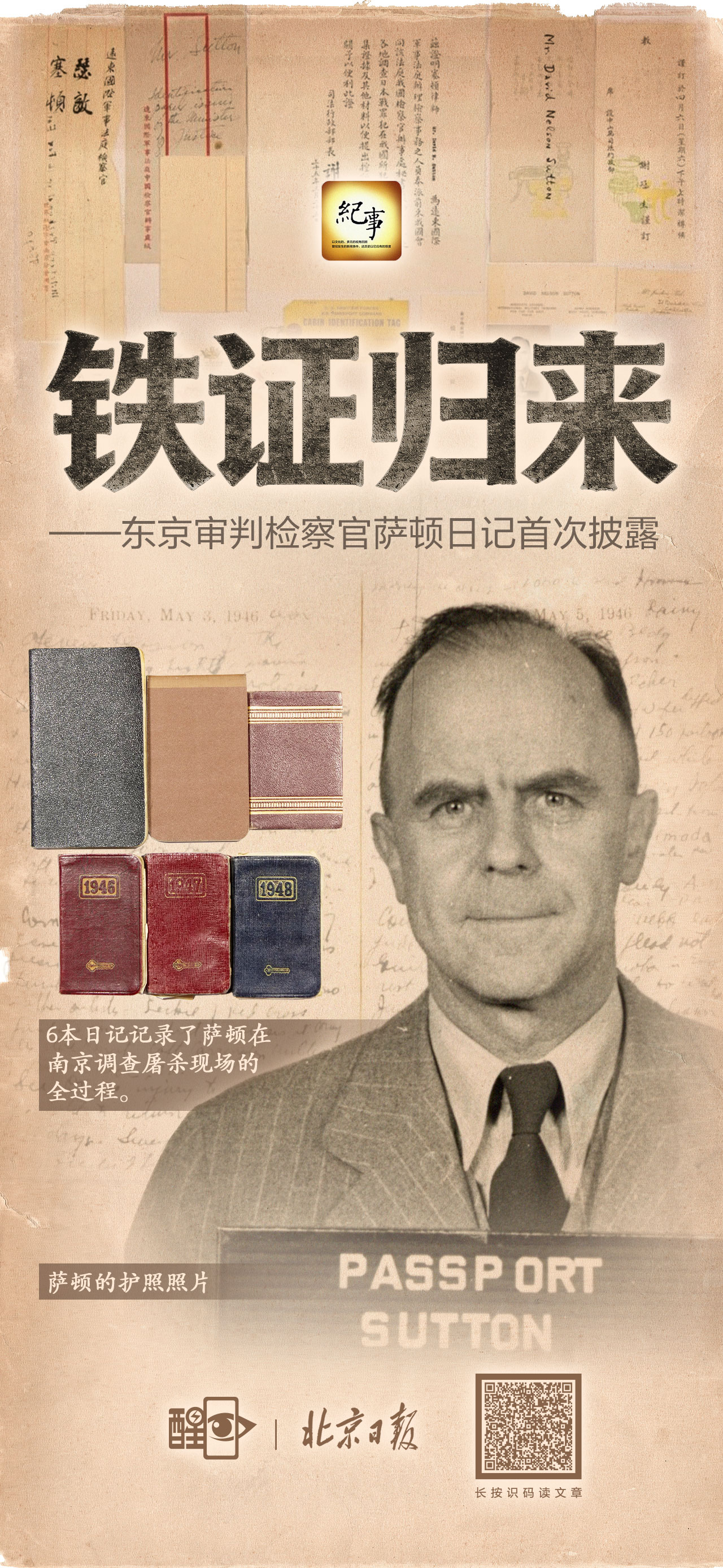 除了这6本日记,一同回国的还有6份“关于中国的报告”,内容涉及南京大屠杀、日军逼迫中国人种植鸦片等。此外,还有萨顿的法庭出入证、护照照片以及中国官员为其签发的通行证等。