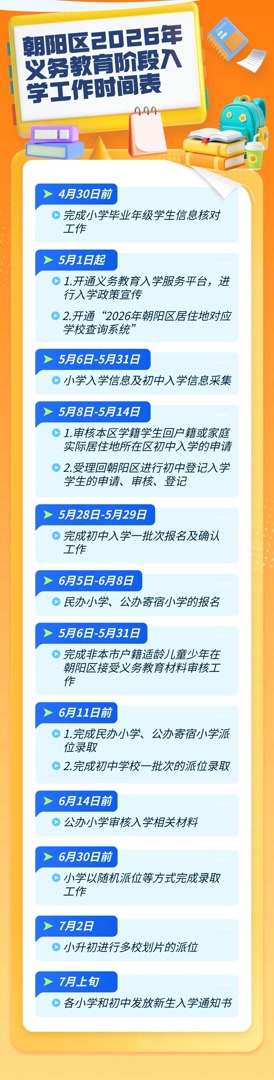 4月28日,朝阳区发布2026年义务教育阶段入学工作的意见。该区教委根据适龄儿童少年的人数、学校分布、学校规模等因素,按就近原则,根据适龄儿童少年报名志愿(或意向)以随机派位等方式进行统筹分配入学。