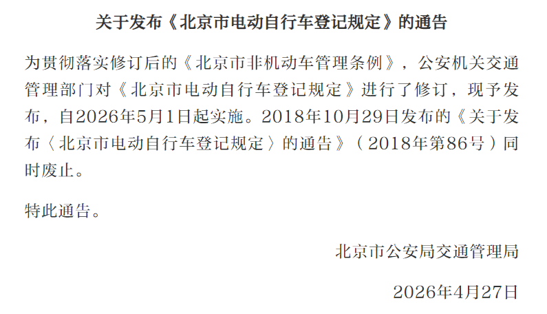 新修订《北京市电动自行车登记规定》5月1日施行,旧规同步废止,单位及个人办理登记需遵新规。详情>>