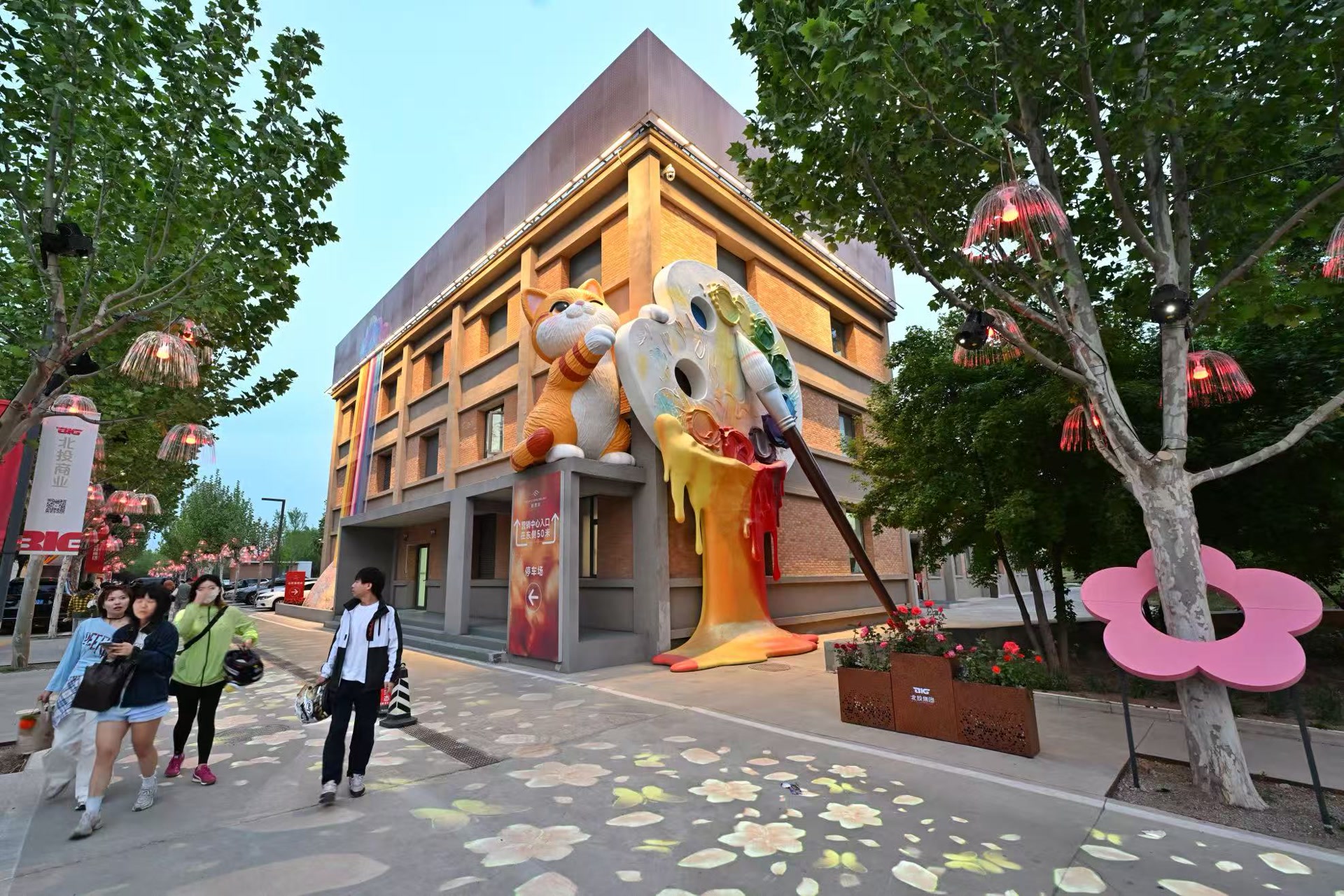 “福园”旁边,首都公共艺术创作基地也同步焕新,九大建筑美陈各具特色,点亮园区视觉氛围。一只调皮橘猫主题装置以打翻调色盘的创意造型,让艺术色彩流淌于园区各处;原造纸七厂烟囱经亮化改造后,成为园区视觉核心;彩色热气球、巨型玫瑰、云朵秋千、星光森林、七彩祥云等景观错落分布,与福园景观遥相呼应,让艺术变得触手可及。