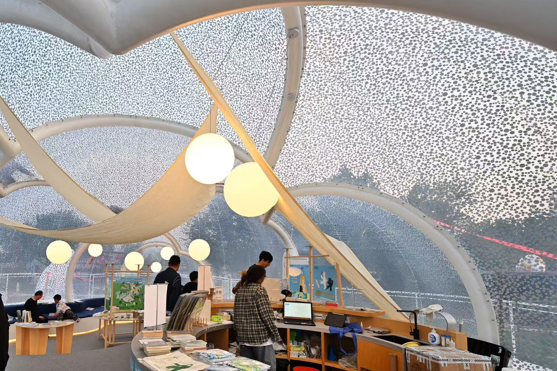 项目运营方北投集团相关负责人介绍,福园有六大充满巧思的桥上景观,依托这些特色建筑引入了户外、咖啡等多元商业业态,将休闲体验与品质消费深度融合。例如,“小云朵”建筑以极简的材料创造出轻盈的透明空间,打造为一处文创市集;“飞屋”采用半透阳光板设计,成为一处创意咖啡厅;“量子之心”滑梯坐落于高线与绿地之间,成为亲子打卡地标;原北运河桥洞改造为“流光隧道”,引入简餐、酒馆等业态。