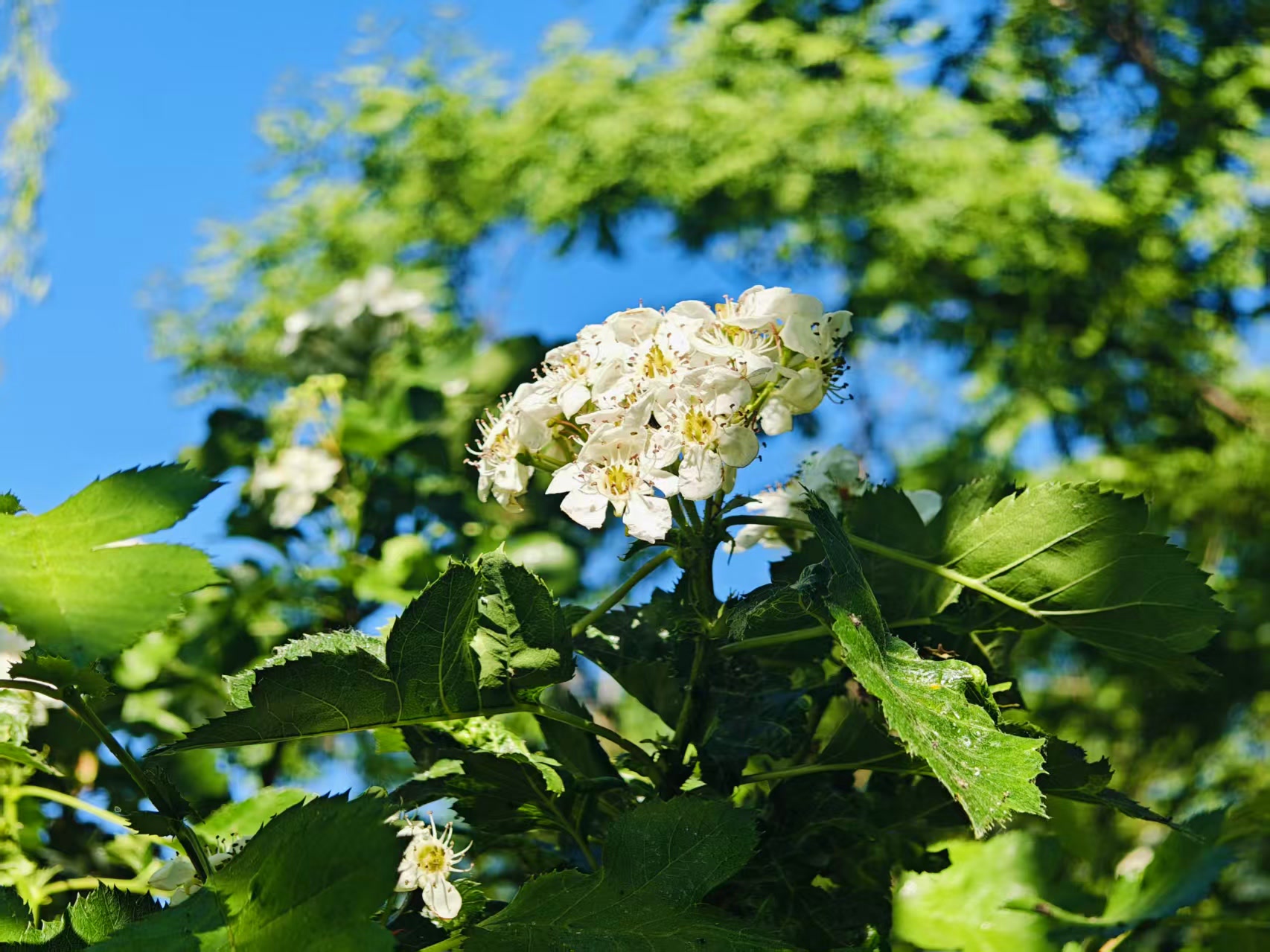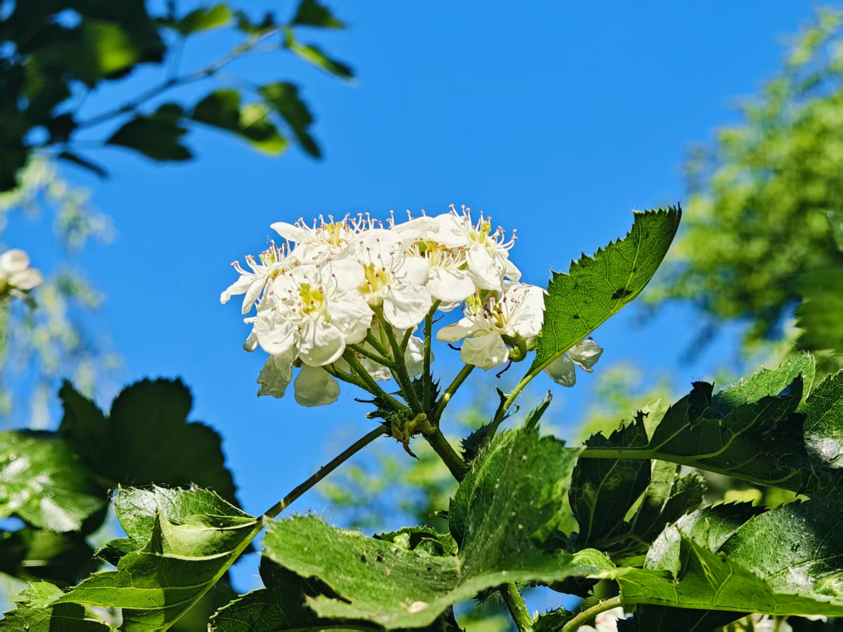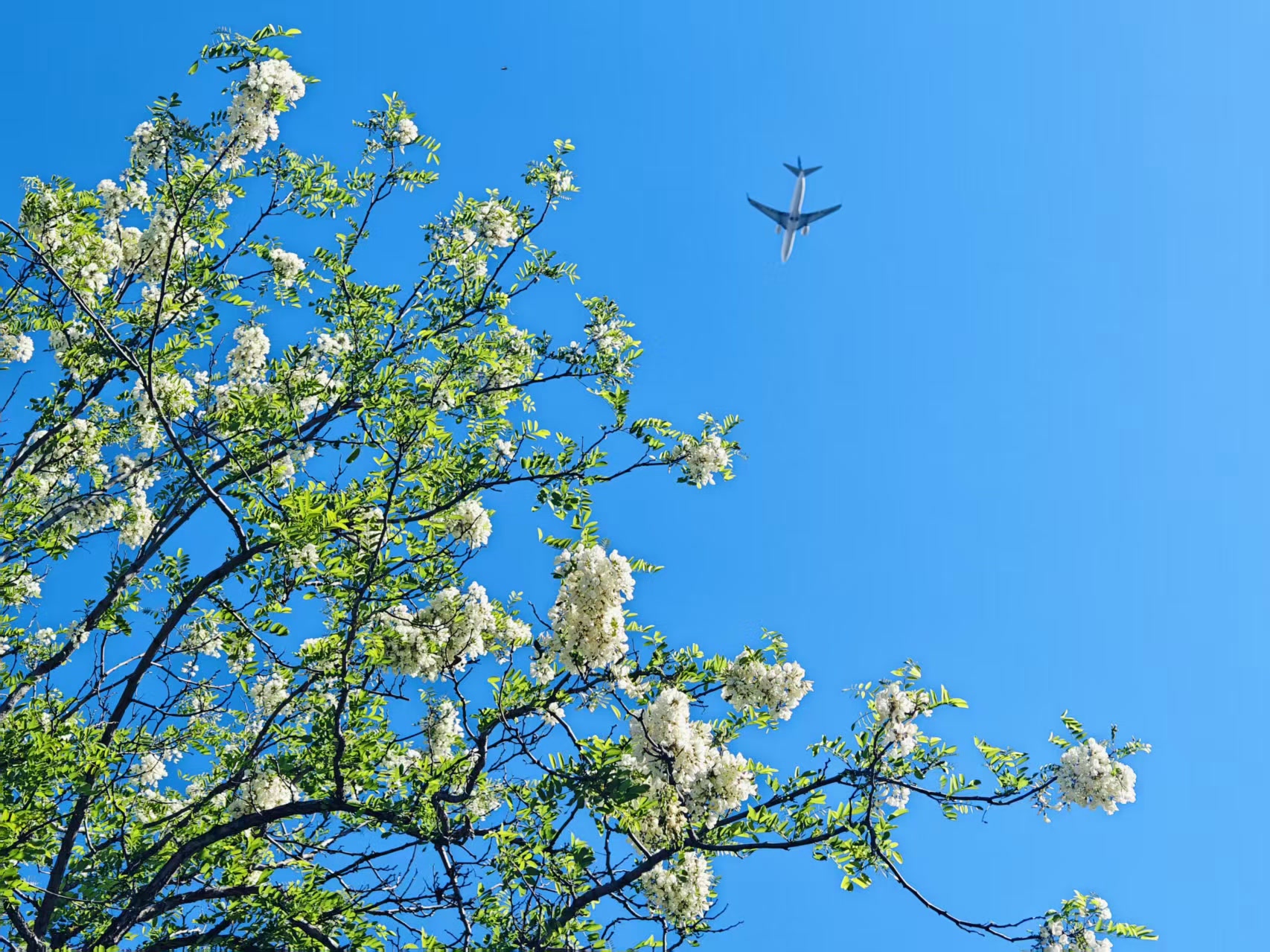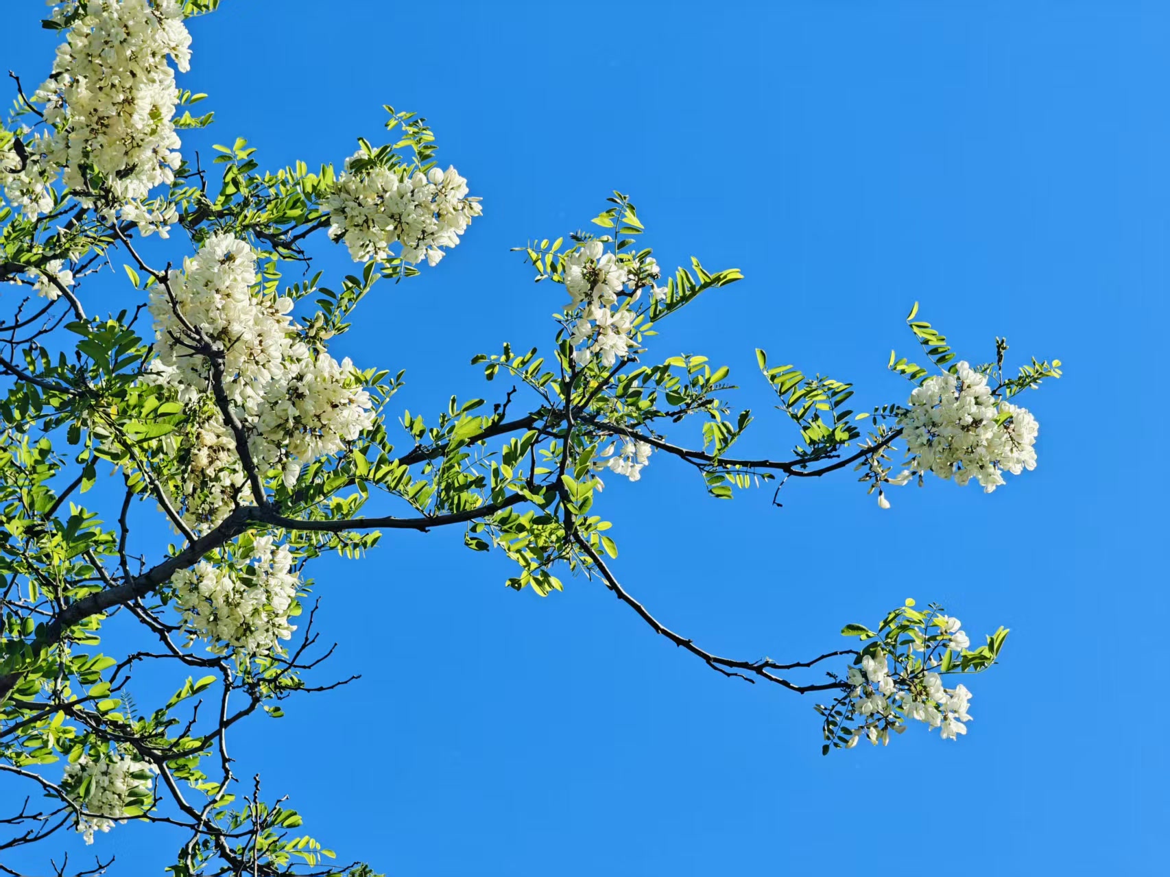 4月29日,北京天空晴朗,在蓝天映衬下,花团似雪,绿叶如翠。
