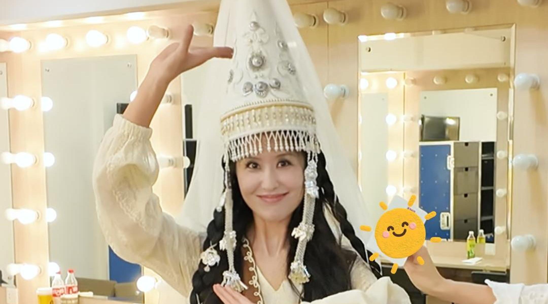 主播在歌舞剧《草原之夜》后台体验哈萨克族saukele帽子