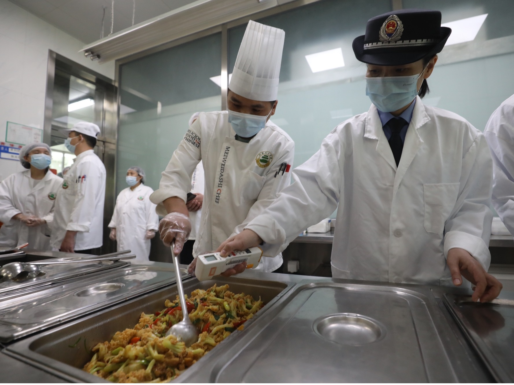 “分餐前先给菜品测温,70℃,达标了。”初三开学第一天,他们来了