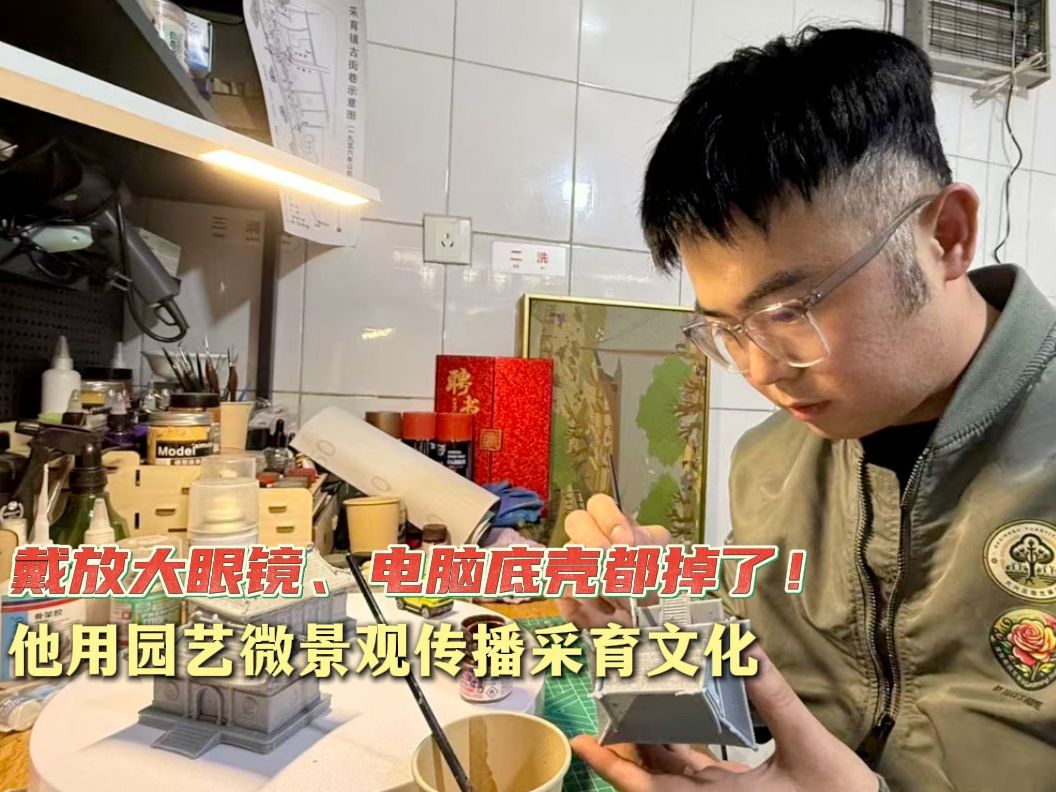 村里的年轻人|戴放大眼镜、电脑底壳都掉了!他用园艺微景观传播采育文化