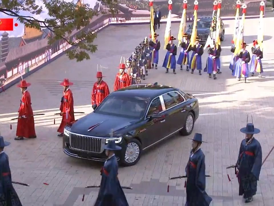 视频丨习近平乘车抵达庆州博物馆 韩国总统热情迎接