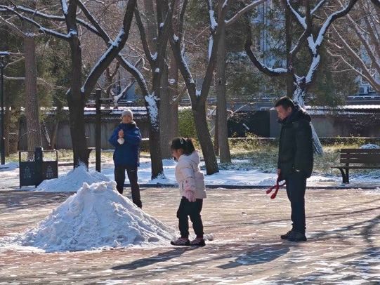 北京雪后公园赏景游人多,提防“脚下一滑”