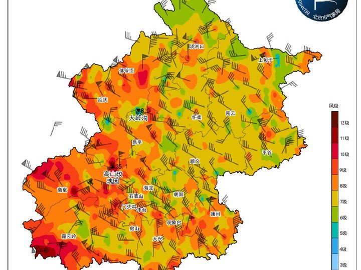 北京最近2小时西部南部风力明显,预计未来2小时大风天气持续