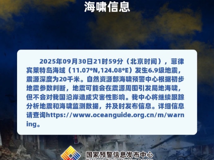 海啸预警中心:菲律宾地震不会对我国沿岸造成灾害性影响