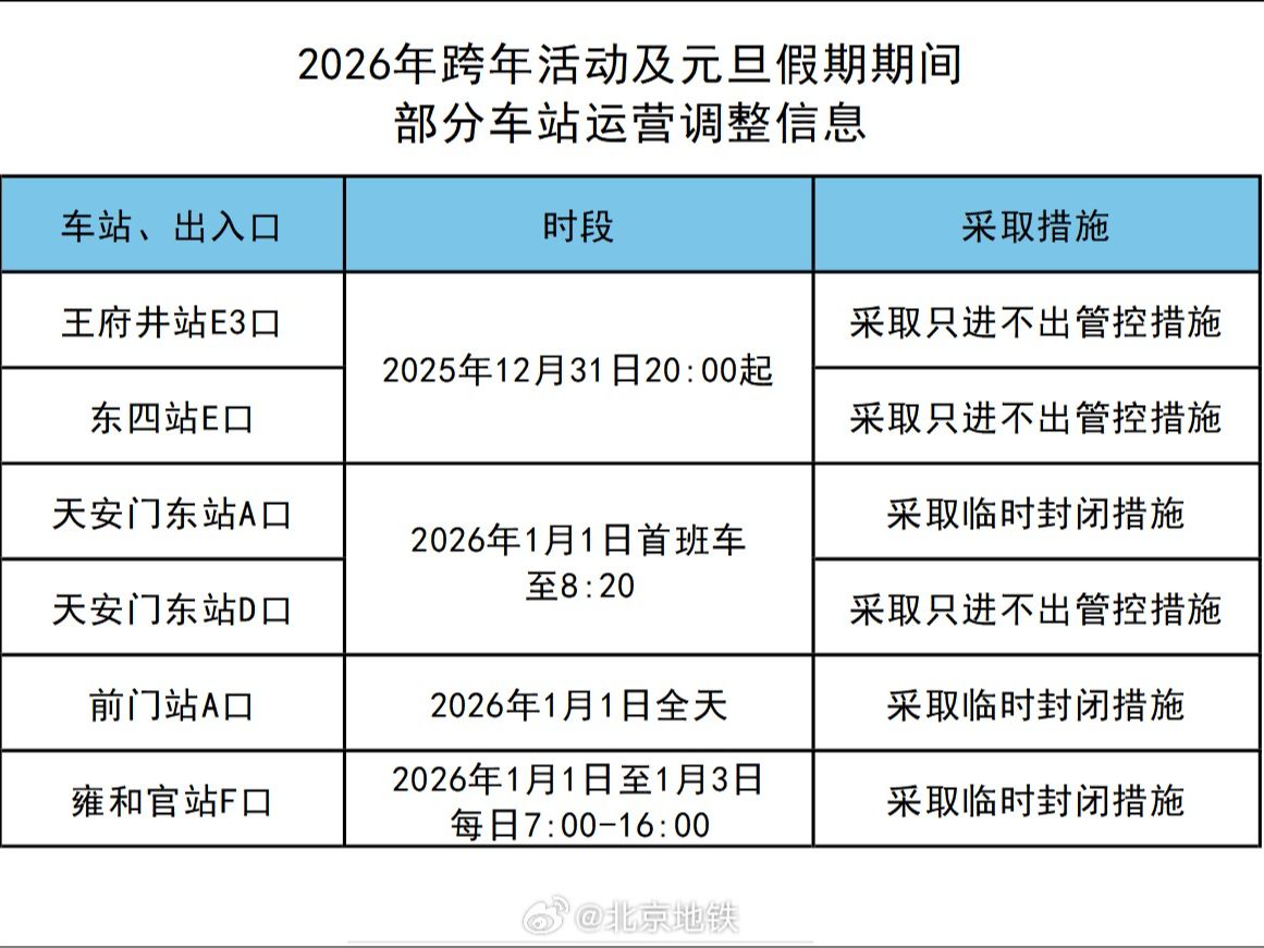 跨年夜及元旦期间,北京部分地铁站出入口将分时段管控