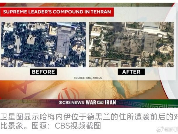 美媒发布卫星图,显示哈梅内伊住所遭袭的前后对比景象