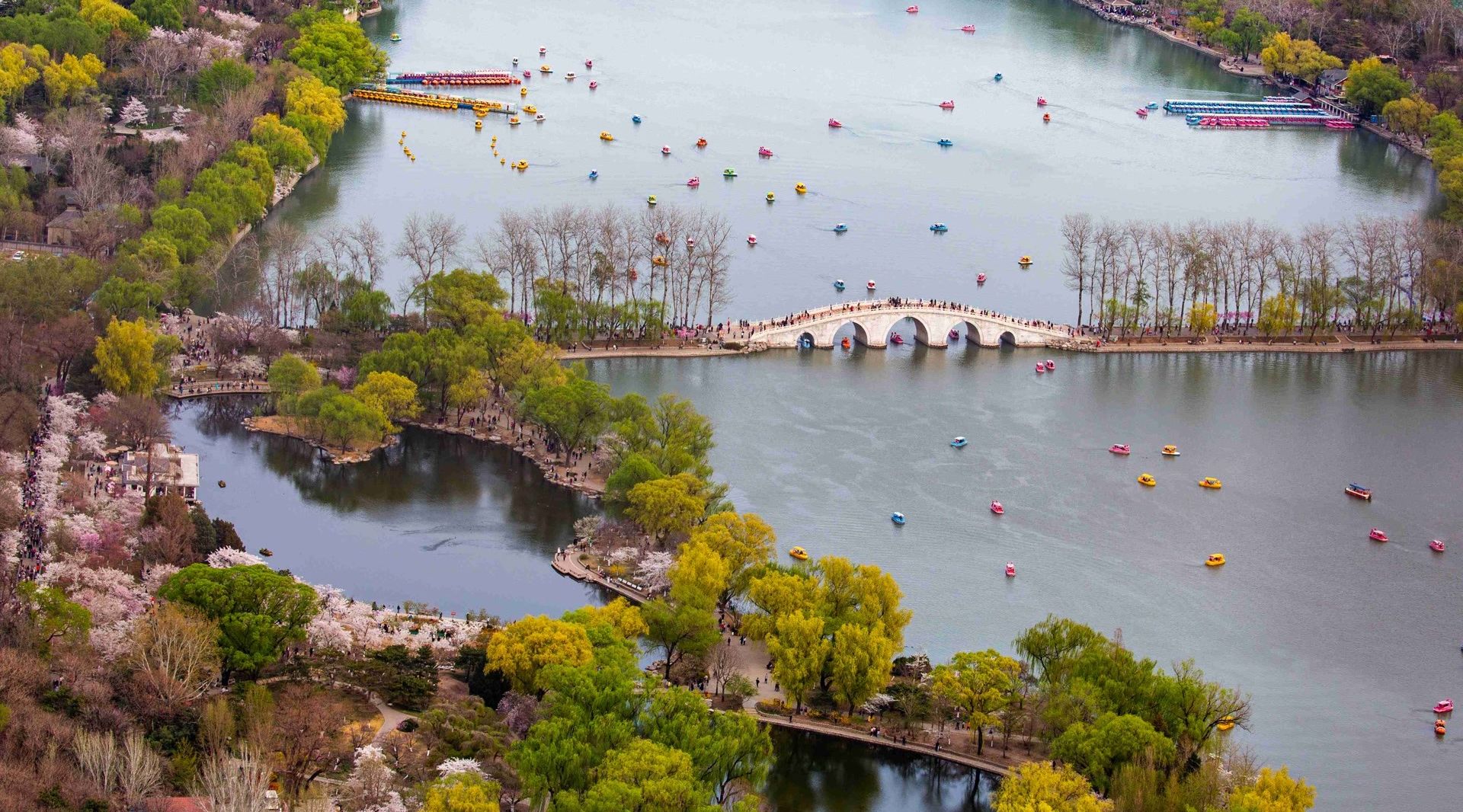 俯瞰玉渊潭:一池碧水伴银桥,花红柳绿满眼春
