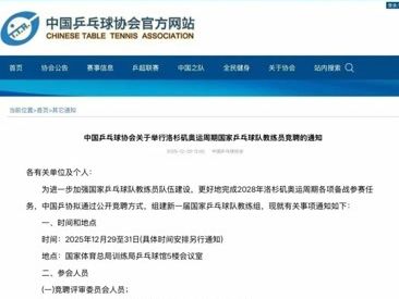 中乒协将举行新周期教练员竞聘 增设副总教练岗位