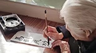 参加三届“墨缘杯”老年书法展,105岁老寿星笔力不减,挥毫祝大家“马到成功”